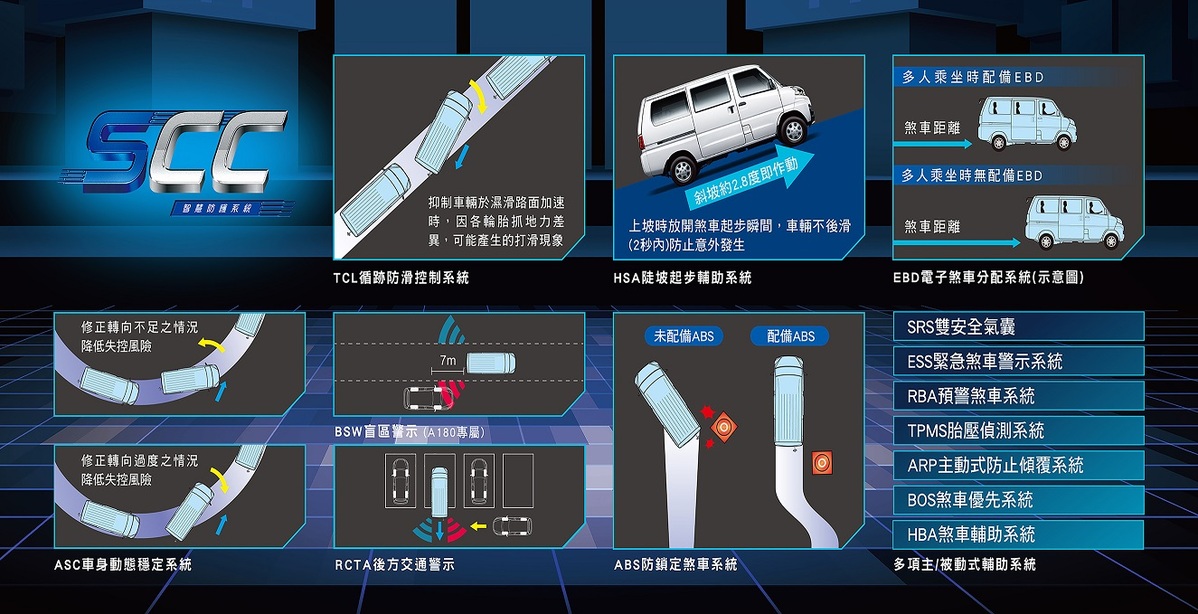 全新e-VERYCA(五人座版本)配有中華商旅獨創SCC(Safety Control Center)智慧防護系統,包括SRS雙安全氣囊、ARP主動式防止傾覆系統、ASC車身動態穩定系統、HSA陡坡起步輔助系統等多項主被動安全配,另搭配ADAS智能安全輔助系統,在風險發生前提前進行警示達到全方位守護。並搭載「智能管理車載系統」,遠端連結車輛資訊,能夠收集車輛相關資訊,如電池系統健康、充電狀態、車輛所在地等,即時回饋CMC協助客戶解決電動車行駛間的各類突發狀況,協助車主保持車輛正常運作。