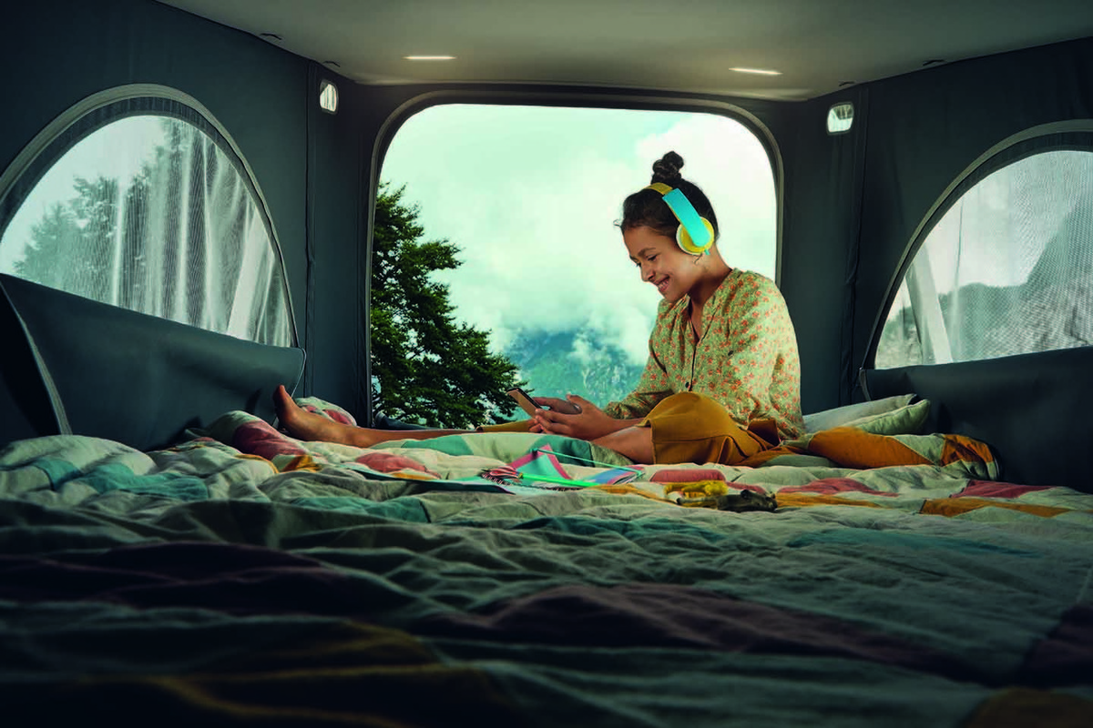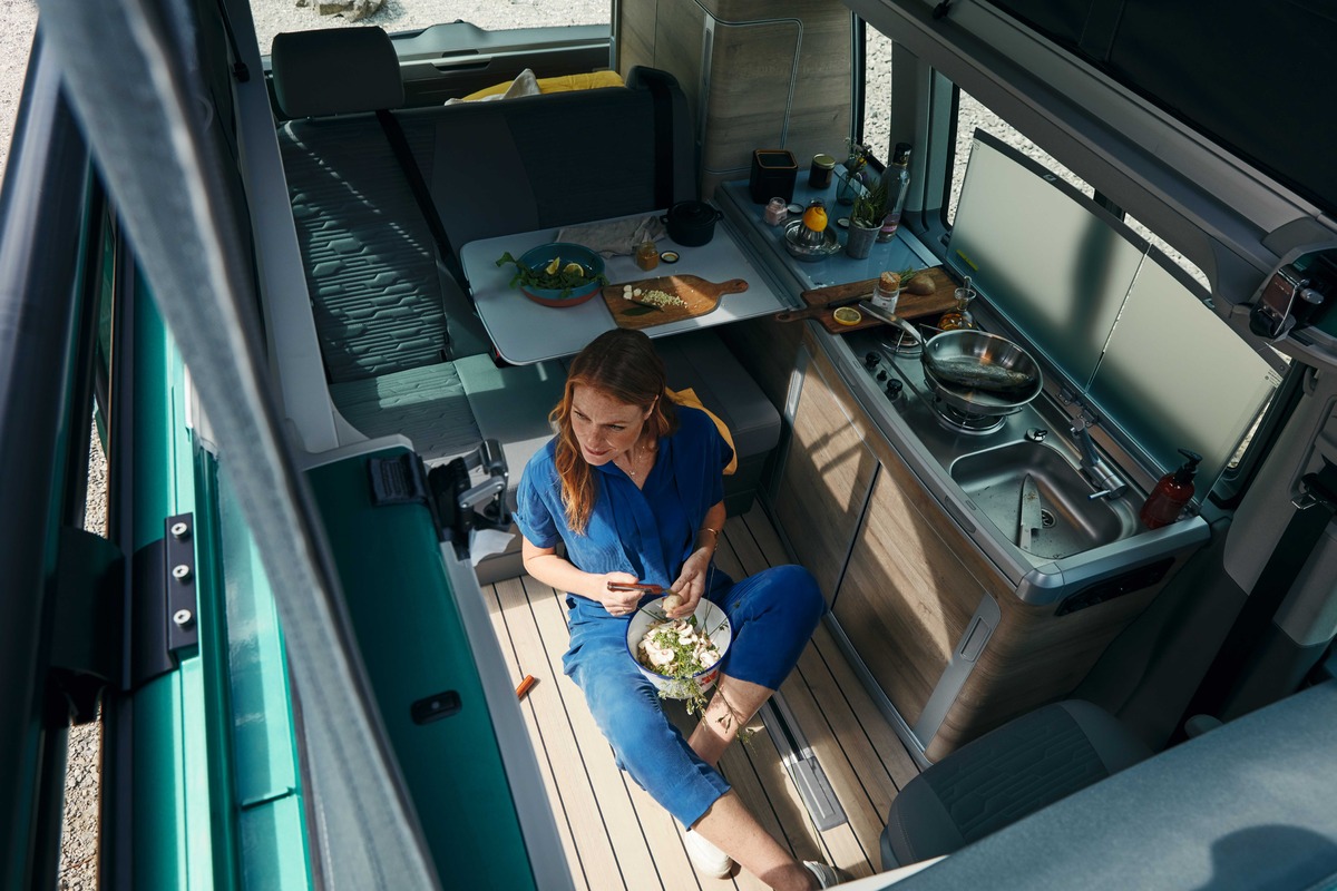 此外,雙前座180度旋轉座椅還可以面朝後方,與後座雙人座床椅「面對面」,加上全功能流理台側邊的多功能摺疊板,一瞬間就可搖身變成一家人互動的客廳。晚上就寢時,只要將乘客艙床椅向後攤平,與後方床架結合,就成了舒適的雙人床臥室;搭配標配的環艙遮光簾,提供一家人一夜好眠的睡眠品質和車室內的隱私。上鋪也升級為更符合人體工學、由54組獨立碟形彈簧組成的彈簧床架,輕鬆用雙手將液壓升降式車頂帳篷升起,就是另一處舒適臥鋪。無論是互動聊天的起居空間、烹煮飲食的餐廳,還是睡眠休息的房間等,T6.1 California Coast都可以完美勝任、提供車主與家人享受天倫之樂。