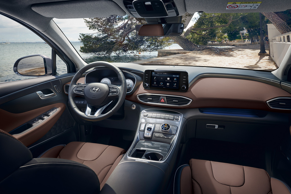 The New SANTA FE 外觀大膽求新,王者之尊的內裝亦邁向高質感進化,選用頂級深棕雙色材質鋪陳車室豪華氛圍,細膩縫線層疊高級鑽石紋真皮座椅,並具備雙前座通風加熱/多向電動調整(附4向腰靠與2向腿靠),以及駕駛座2組記憶與Seat easy access駕駛座輕鬆進出裝置,提供無可挑剃的舒適體驗。The New SANTA FE 亦全新導入12.3吋TFT-LCD全尺寸高解析度數位儀錶、8吋多媒體系統(支援無線Apple CarPlay & Android Auto),高置式鞍座控制台以及國內款首度出現的SBW電子線傳排檔系統,整合加入Qi無線充電座與DRIVE MODE多重駕馭模式控制介面,完備兼容人性與科技的雙重特性。