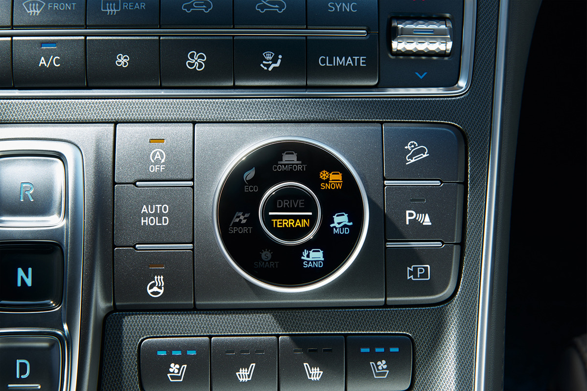 此外,The New SANTA FE標配整合Eco/Comfort/Sport/Smart模式的DRIVE MODE ,更提供同級最先進 HTRAC 4WD智慧型可變四輪傳動系統 (柴油GLD-C車型專屬),智慧判別分配前後軸動力輸出,搭配TERRAIN MODE越野駕馭(Snow/Mud/Sand)多重模式輔助,隨時都能從容不迫征服領地。