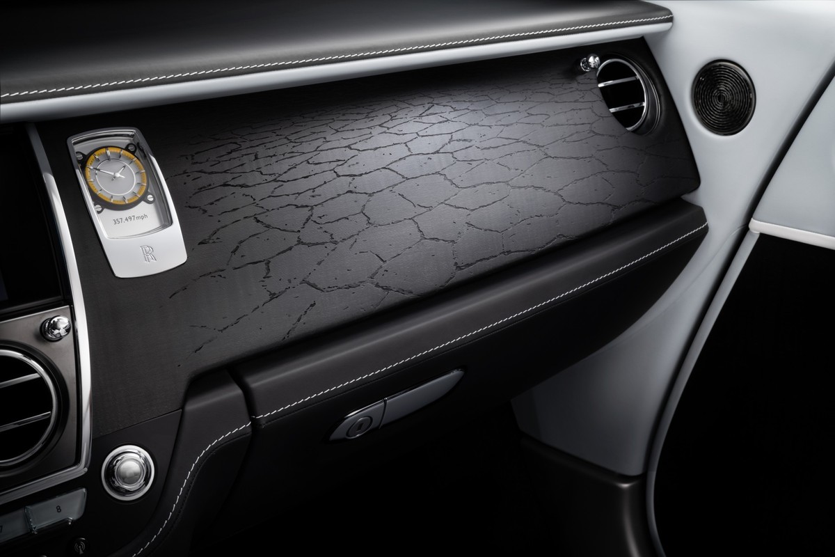 這個簡單而巧妙的想法在Wraith及Dawn Black Badge Landspeed典藏版中被清晰喚醒,方向盤中央上部點綴著細膩的刺繡深色線條,該線條一直延伸至主駕座椅的中心線,這一設計也強調了Wraith及Dawn的駕駛屬性。博納維爾鹽灘看似光滑,但細小裂縫層層密佈。這種獨特的紋路完美再現於Wraith及Dawn Black Badge Landspeed典藏版的儀錶台和中控台的木質飾板中,表面本身還進行了數位化還原。Wraith及Dawn Black Badge Landspeed典藏版車內前部面板採用拋光陽極氧化鋁。這些車內設計與Thunderbolt遙遙呼應,並傳承了Thunderbolt車型獨特輪廓、傳奇記錄等無數細節。Wraith Black Badge Landspeed典藏版 還描繪了喬治·艾斯頓駕駛時所見的景色在後排座椅之間上方位置雕琢有博納維爾的銀島山脈的輪廓。