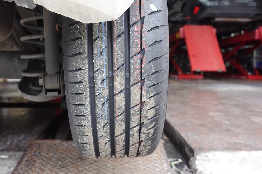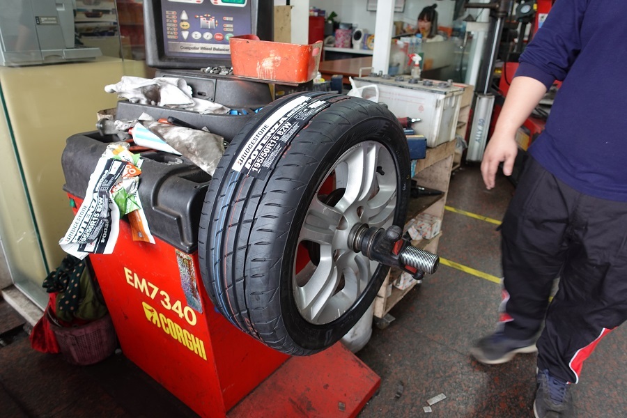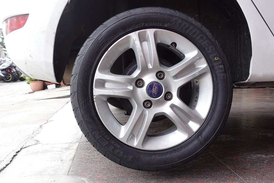 這次我們選擇一部已經有十年車齡的Ford Fiesta來裝配RE004,它的標準配用規格是195/50R15,之前在換胎時都是以兩條更換的方式進行,因此舊胎的前後品牌並不一致,這次為了測試RE004,乾脆將四條胎都換成RE004,RE004沒有指向性的需求,但是因為胎壁結構的不同而有外側與內側之分,經過單胎動態平衡及四輪電腦定位之後,前後不到十五分鐘的時間就換裝完成。