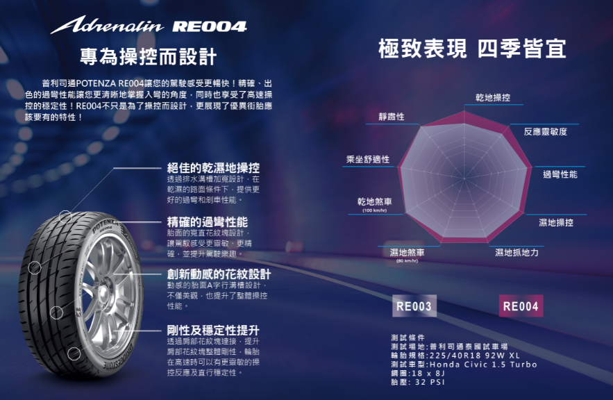 POTENZA Adrenalin RE004還運用全新的複合材料創新技術,將二氧化矽膠料均勻分布於輪胎中,可大幅改善輪胎在溼地的煞車和操控性能,更可降低滾動阻力,減少車輛的環境足跡。此外,肩部花紋塊的剛性提升,也可讓駕駛在高速行駛時,同時兼顧靈敏的過彎反應,以及直行的穩定性。