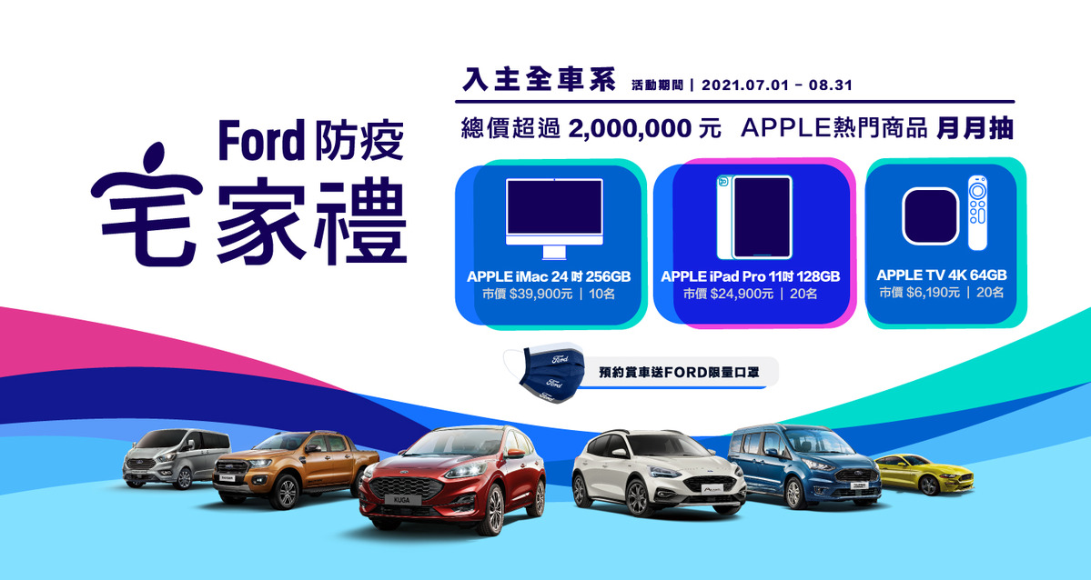 八月入主Ford全車系,即有機會抽中Apple最新系列商品,包含:iMac(10名)、iPad Pro M1與APPLE TV 4K(各20名),自七月起連續兩個月至8月31日止,共抽出100名,總價值超過200萬元。