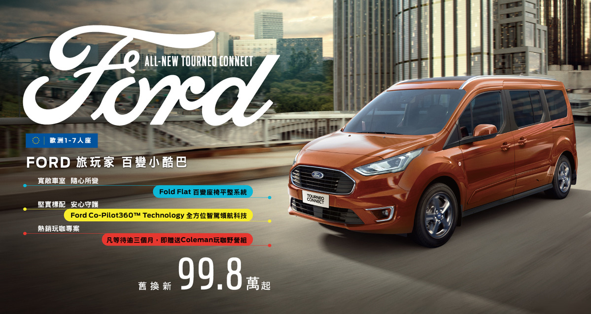 The All-New Ford Tourneo Connect旅玩家以Fold Flat 百變座椅平整系統和Ford Co-Pilot360TM Technology全方位智駕領航科技,打造出同級最豐富車室空間應用以及最先進的主被動安全配備,八月入主除可享舊換新價99.8萬起,「The All-New Ford Tourneo Connect熱銷玩咖專案」也在八月持續延長,若準車主候車逾三個月(訂單簽署完成日至領牌日),Ford將致贈美國百年歷史戶外露營品牌Coleman玩咖野營組,包含野營必備的Coleman輕鬆摺疊長椅及Coleman氣墊床。