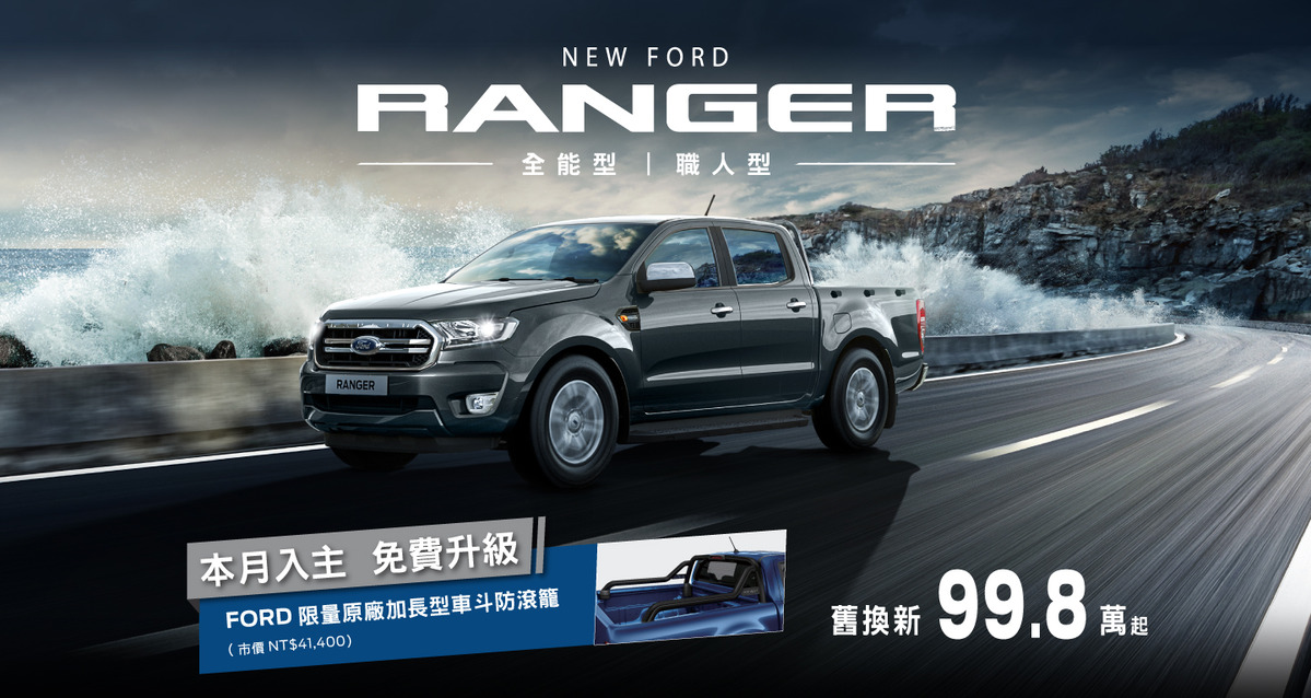 八月入主New Ford Ranger職人型或全能型,舊換新優惠價99.8萬起,本月入主再享免費升級原廠加長型車斗防滾籠(市價NT$41,400),專屬升級機會即刻把握,數量有限,送完為止。