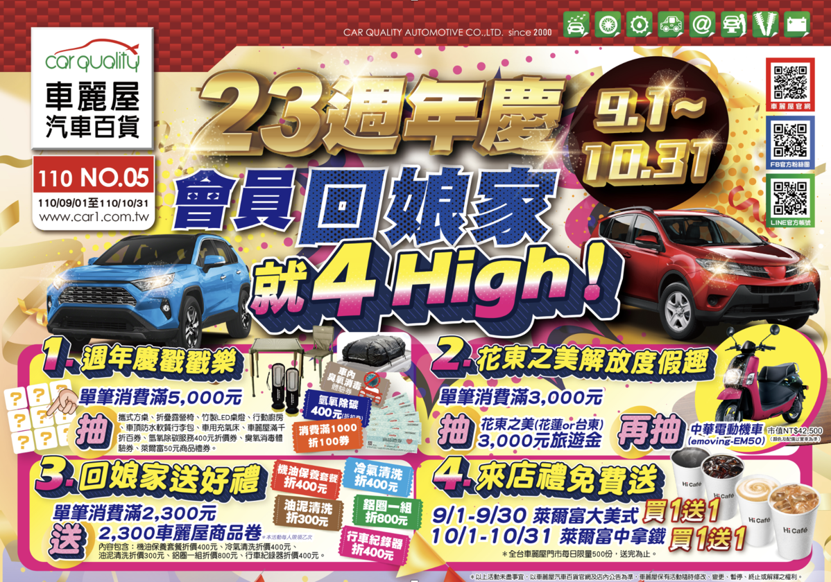 ● 回娘家送好禮:週年慶期間單筆消費滿2,300元,即送價值2300元車麗屋商品卷。內容包含機油保養套餐折價400元、冷氣清洗折價400元、油泥清洗折價300元、鋁圈一組折價800元、行車紀錄器折價400元。