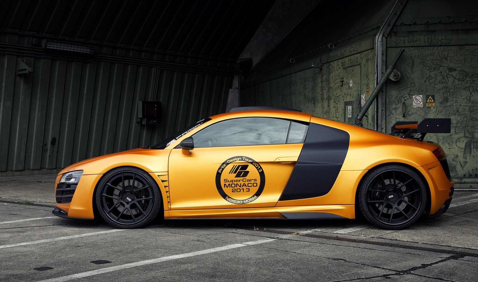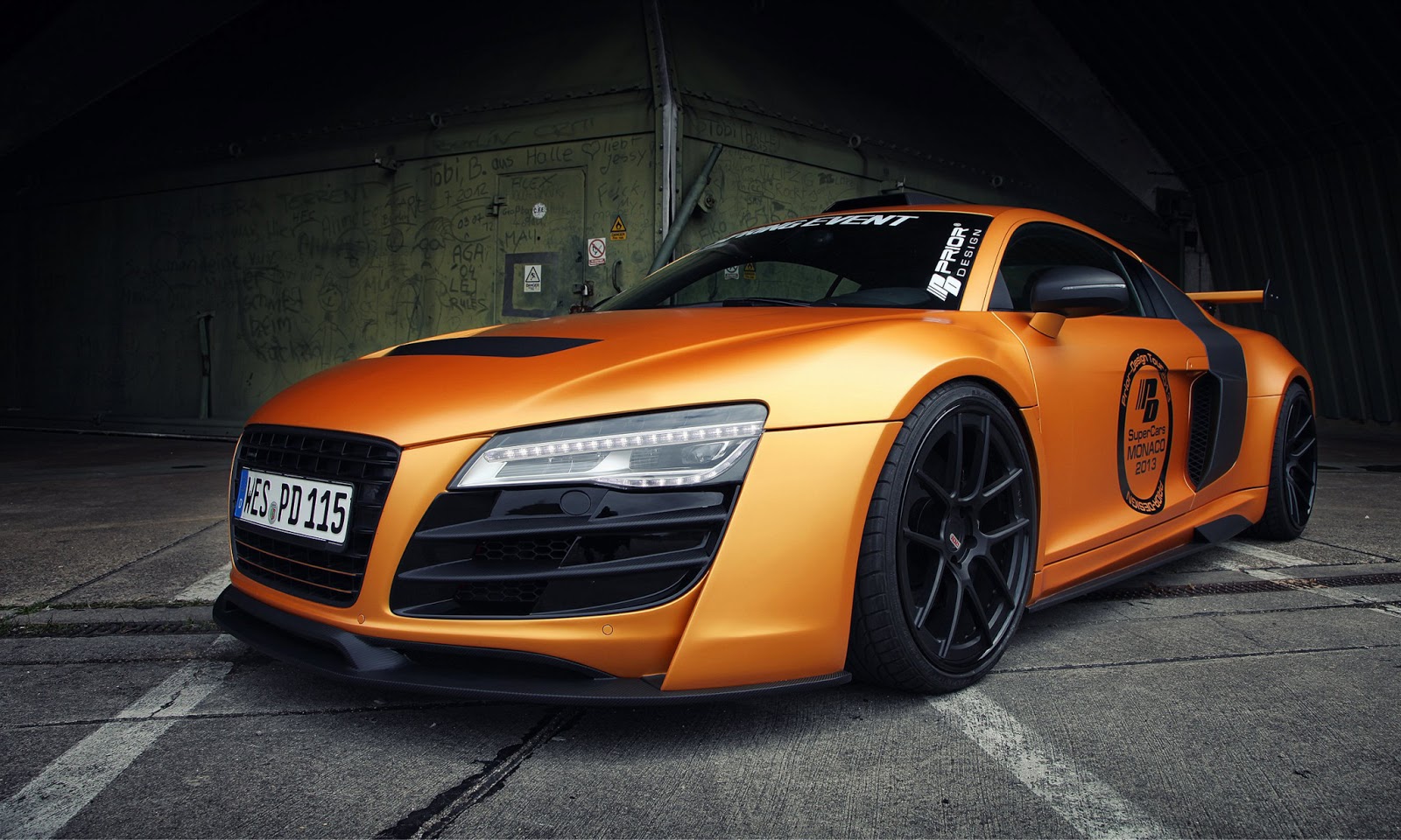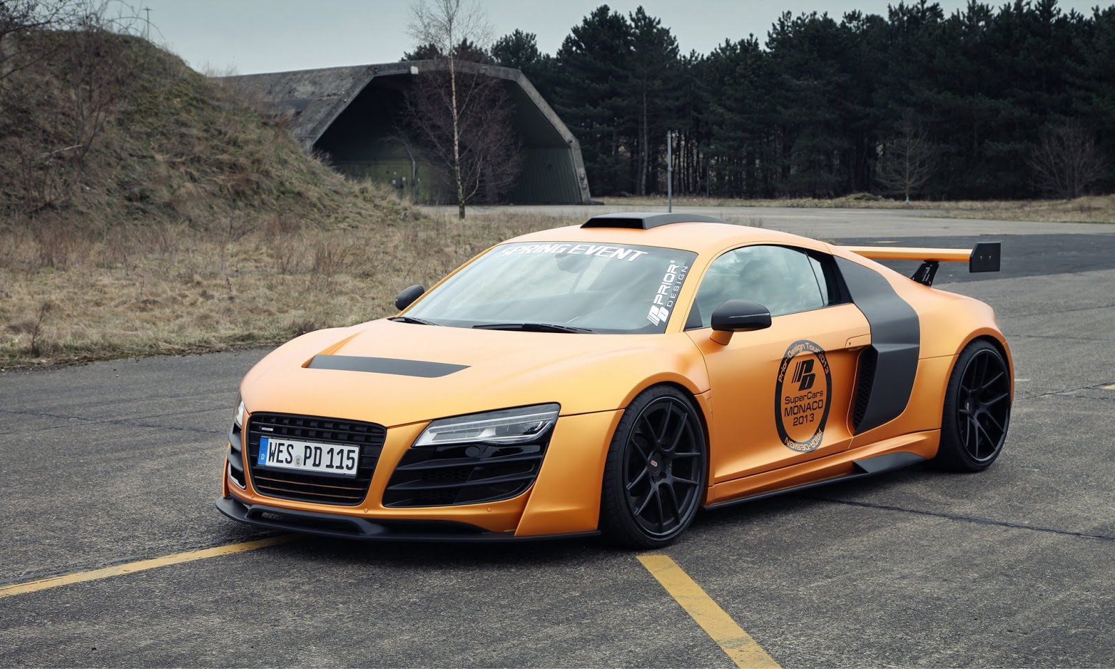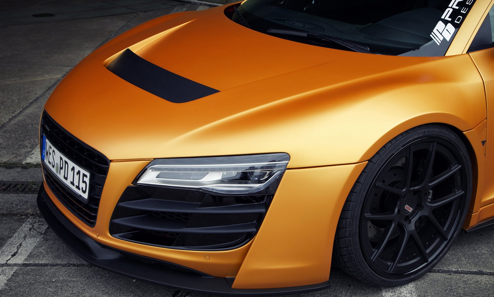 這輛消光橘R8是由德國的改裝廠Prior Design操刀,這也是他們對於R8的第二次改裝,門上的標誌證明了他們在2013摩納哥超跑展上露面。
