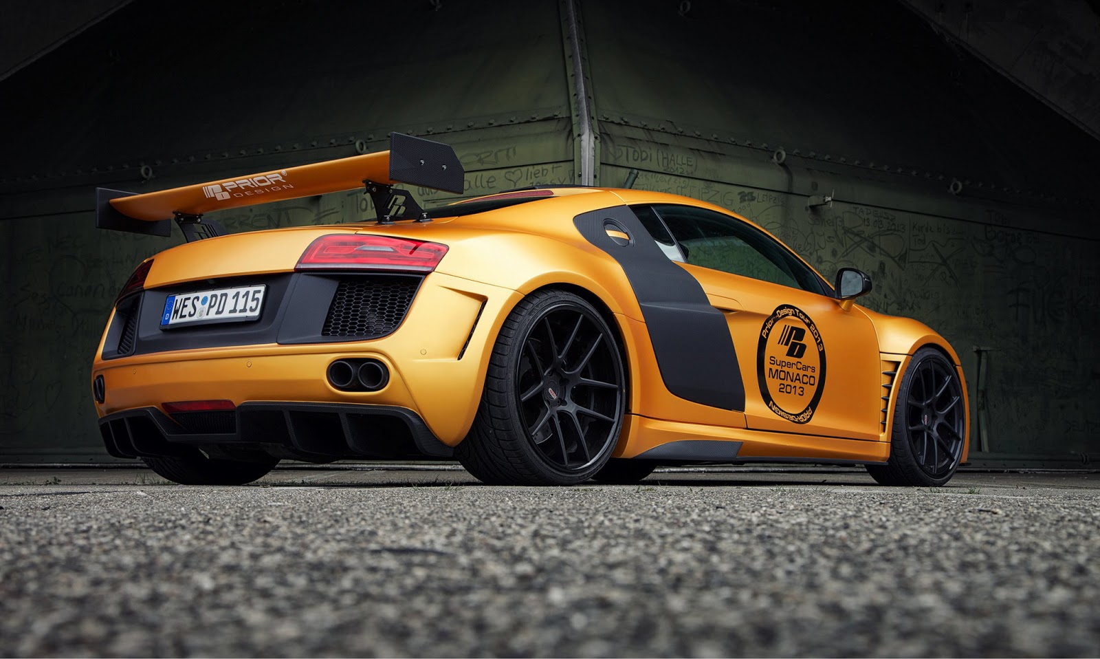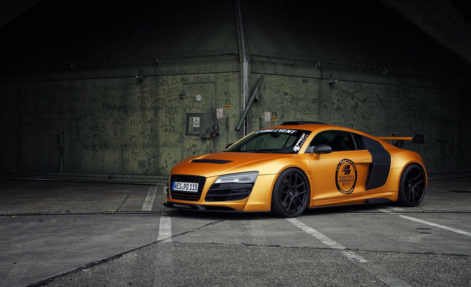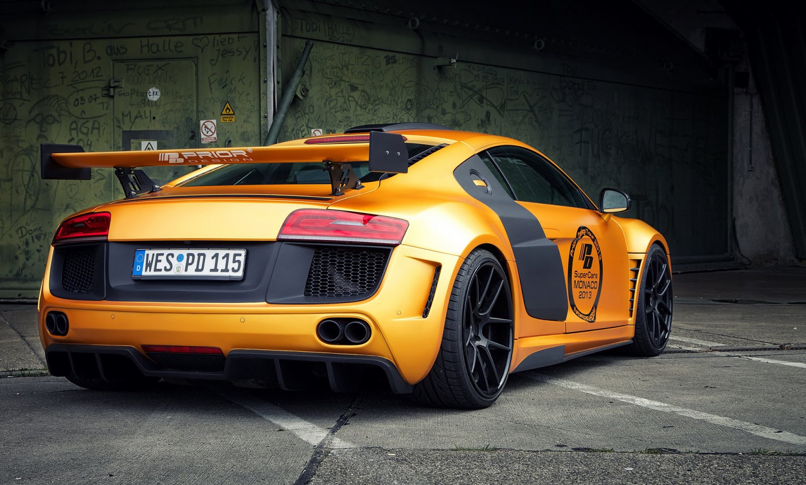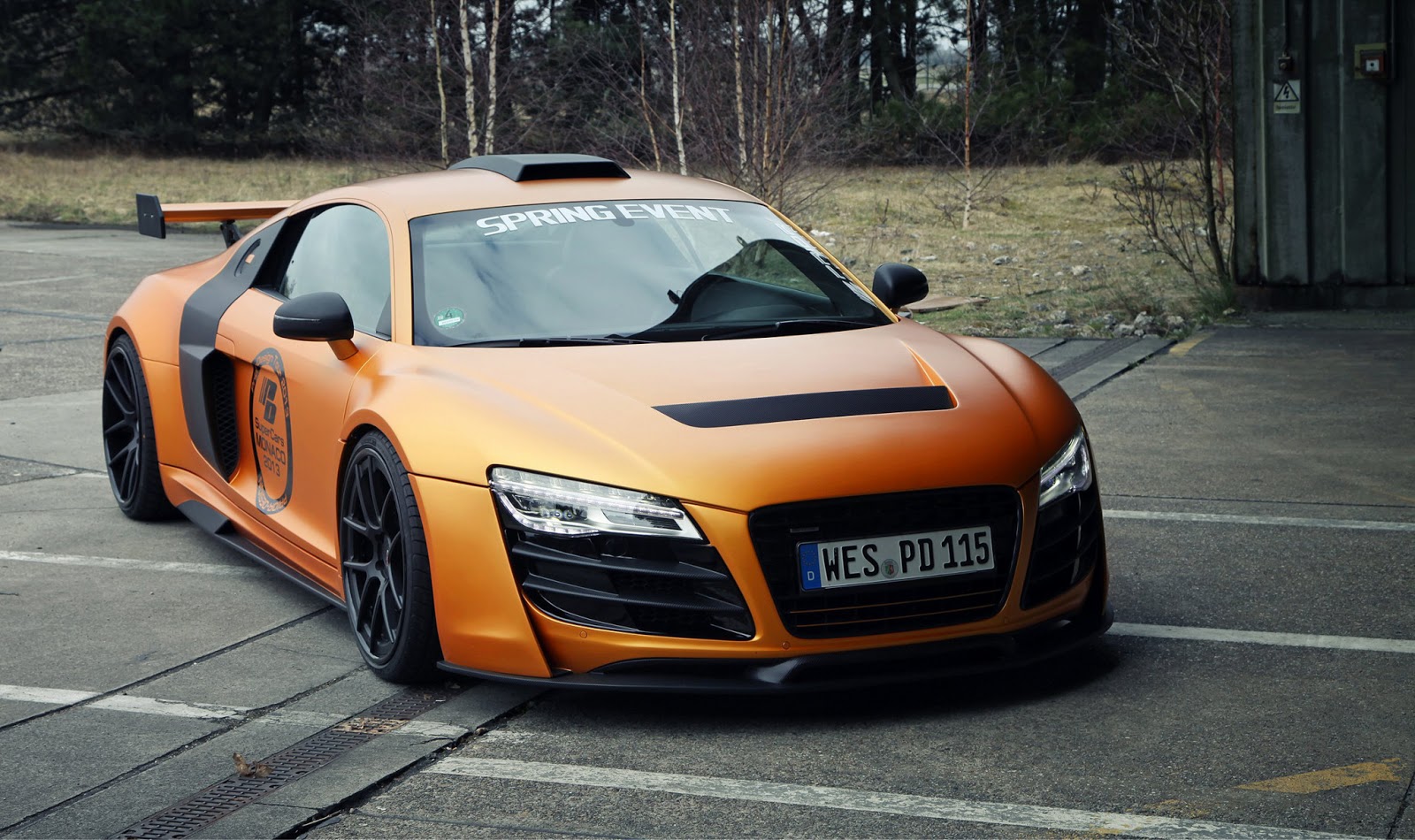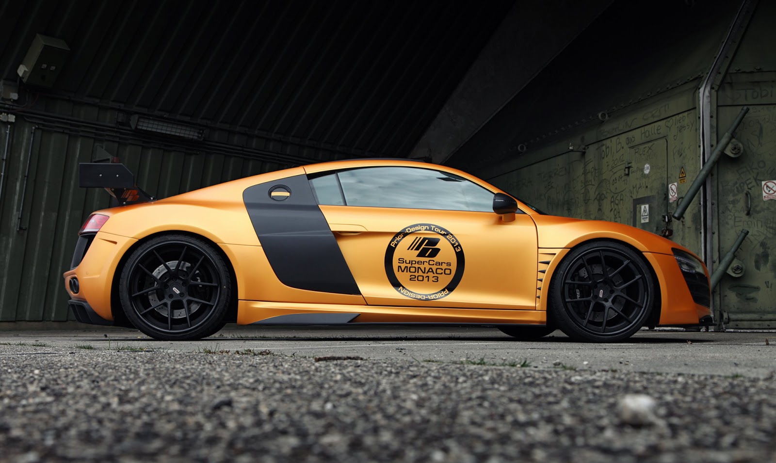 這輛消光橘R8是由德國的改裝廠Prior Design操刀,這也是他們對於R8的第二次改裝,門上的標誌證明了他們在2013摩納哥超跑展上露面。