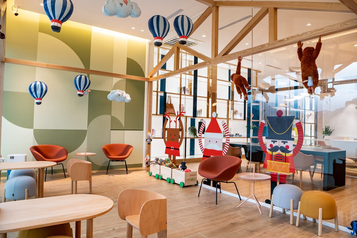 二樓空間集新車展示區、客戶休憩區、 VOLVO Fika 、洽談室、精品展示區及兒童遊憩區於一身,採光明媚且挑高的新車展示區可同時擺放 10 款車型,讓每位賓客能在舒適無壓力的空間飽覽 VOLVO 全車系;客休空間以白色片狀飛鳥垂墜裝飾,隱喻空間的趣味與豐富性,同時彰顯 VOLVO 對於鄰近關渡平原自然生態的尊重,呼應整棟建物永續性和綠色環保的設計核心。在多達 100 席位的客戶休憩區中可見到單椅大師 Hans Wegner 「以人為本的舒適性」的設計作品,也設有注重個人隱私的高筒座椅,若是需要辦公的車主,開放式會議長桌能提供專注的工作氛圍。兒童遊憩區則是展廳採光最好的童趣角落,以玻璃盒中的小木屋為概念,引進瑞典經典童書「長襪皮皮」和其作者阿思緹‧林格倫 (Astrid Lindgren)的繪本,讓孩子們盡情探索瑞典文化。