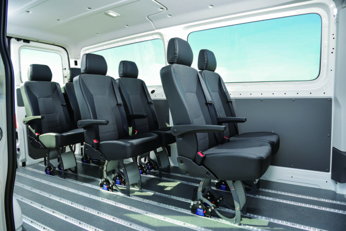 後艙空間中,全新Crafter九人座客車無論是中軸平頂或長軸高頂,都配備「聰明變」鋁合金無段式滑軌地板,並且標配採用快拆設計及安全帶配備的6組單人獨立座椅,可依照不同需求自行調整座椅位置,為乘客提供舒適的乘坐空間。全新Crafter標配後艙獨立空調以及出風口更可輕鬆應對台灣炎熱的夏季天候。