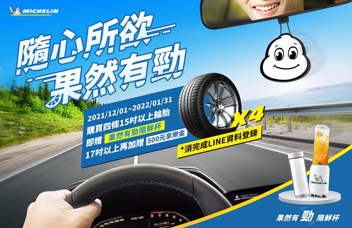 新冠疫情逐漸趨緩,但面對未知的變化及這段期間日益積累的生活壓力,民眾心情不免仍是忐忑不安,這個時候不妨開車兜風、暢意紓壓,藉由享受駕馭帶來的快感,找回生活的「勁」 !今年歲末之際,就對自己好一點吧 ! 幫自己選一組好胎、為愛車提升安全也讓駕馭樂趣再加分。台灣米其林自2021年12月 1 日至2022年1月 31 日止,推出「隨心所欲 果然有勁」促銷活動:消費者在購買4條15吋以上輪胎(不含輕卡車胎),並且到台灣米其林官方LINE@帳號完成相關資料登記,就可獲得果然有勁隨鮮杯註,17吋以上再加贈500元享樂金註,活動期間每位消費者都有一次參加機會。此外,台灣米其林更首度跨界玩創意,除了委請知名饒舌音樂人韓森為品牌填詞作曲外,還特別邀請影視歌三棲藝人暨三金得主(金馬、金像、金鐘)蔡振南在MV中特別演出,一同號召全民「唱 (暢) 」起來,參加「果然有勁盃 饒舌挑戰賽」,用說唱解放心中熱血因子。