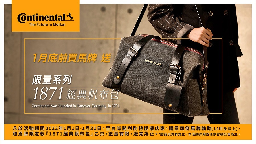 邁向2022壬寅年,適逢值得歡慶的農曆新年時刻,德國馬牌結合1871年創立年份,推出限量款『1871經典帆布包』好禮,獻上給一路支持馬牌輪胎的車主,好運,馬牌一手包辦!即日起至2022年1月30日止,至全台德國馬牌輪胎簽約店家,購買四條馬牌輪胎(14吋以上),即贈馬牌限定款『1871經典帆布包』好禮(數量有限,送完為止)。