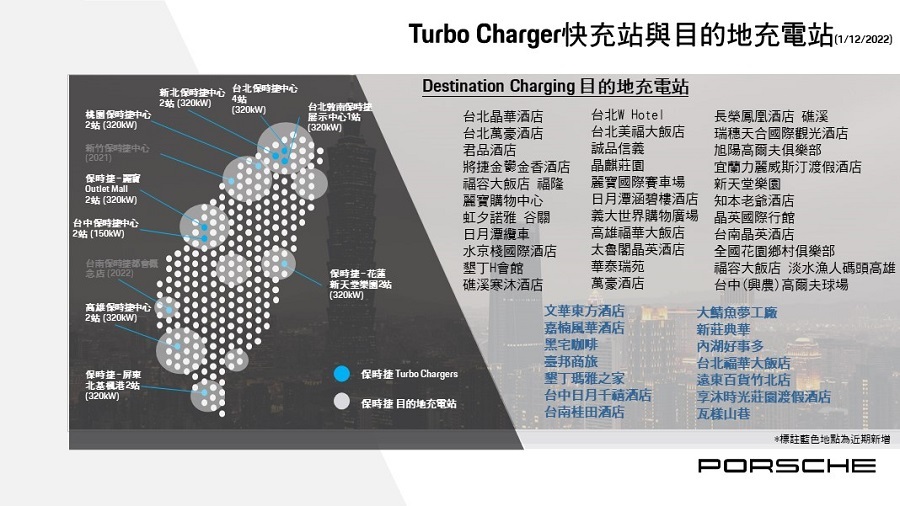 除了保時捷高速充電站,台灣保時捷近期也新增17處目的地充電站 (Destination Charging),包括台北文華東方酒店、台北內湖好事多、遠東百貨竹北店、台中日月千禧酒店、台南臺邦商旅、嘉義市嘉楠風華酒店、墾丁瑪雅之家,以及更多據點。截至今日,保時捷在台共設置 9 處保時捷高速充電站 (Turbo Charging),包含19支充電樁,以及48處目的地的充電站 (Destination Charging),涵蓋全台豪華度假飯店、高爾夫球場及賽車場等地,合計共100支充電樁,服務網路遍及全台各地。