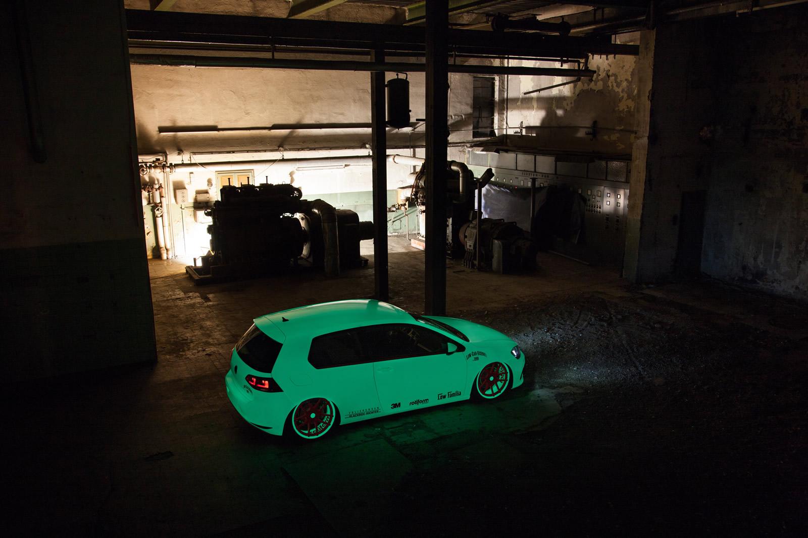 究竟他們對這輛車做了什麼?為了抓住眾人的眼光,他們將一輛黑色Golf的表片包上了一層來自3M的灰白色薄膜,這沒有什麼特別,但是該材質在鏡頭下透出綠光時,這樣的夜光效果可就有什麼了。