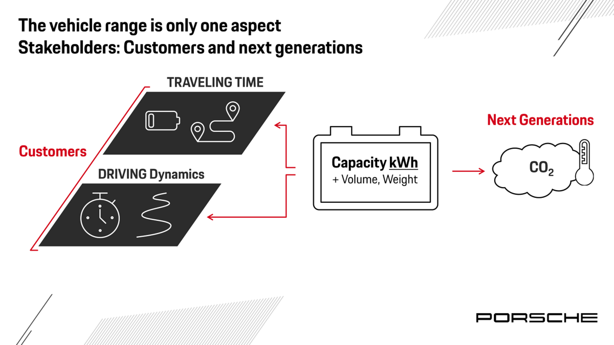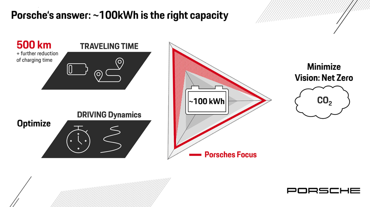 保時捷的研究發現,雖然降低電池容量是減少生產過程碳排放的最好方式,中型電池卻可提供最優異的駕駛動態,大型電池則提供了更長的續航里程,並可縮短行程時間。然而,保時捷獨特的800V充電技術和高效的DC直流充電,卻能讓Taycan可在短短5分鐘內儲入行駛100公里所需的電量。絕大多數研究建議,電動車最佳的行程比例是每充電15分鐘達成2小時的行駛里程;Taycan已能實現這樣的效率,達成更強續航力、行駛長途旅程的目標。