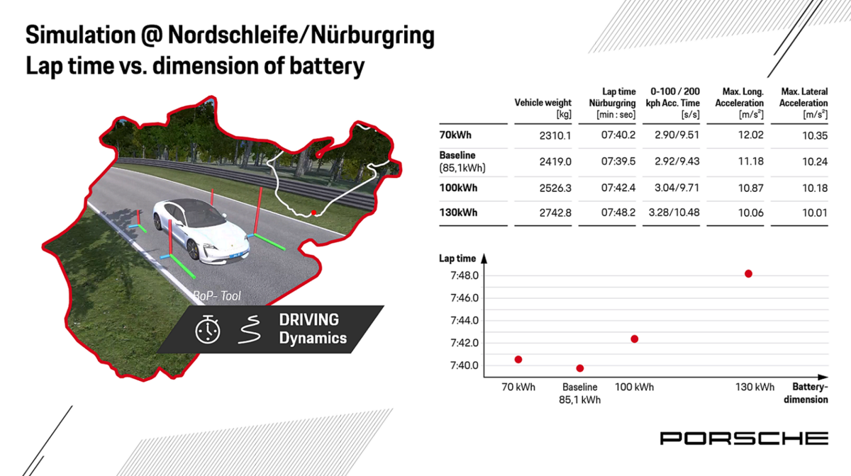 相比之下,100 kWh的電池將使整車重量增加107 kg,儘管電池更強大,單圈時間卻只提高到7分42.2秒,3.04秒完成0~100km/h加速,0~200km/h為9.71秒。當電池容量增加為130 kWh,車身總重增加為2,743 kg時,重量對速度的影響便更為顯著,單圈成績來到7分48.2秒,3.28秒完成0~100 km/h加速,0~200km/h為10.48秒。