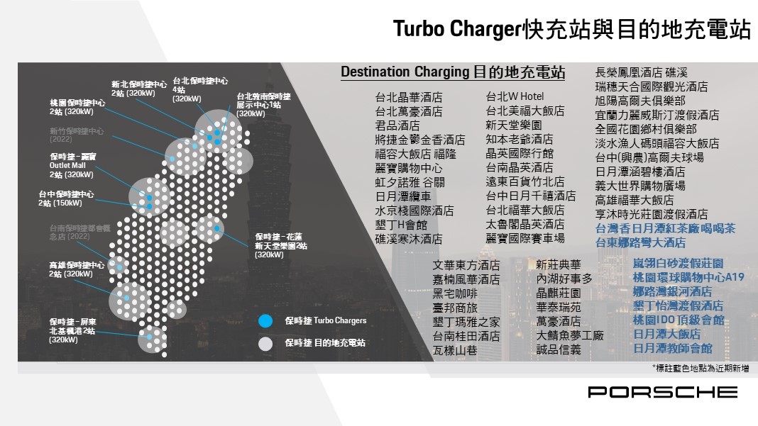 此外,台灣保時捷也新增了9處目的地充電站 (Destination Charging),包括桃園環球購物中心A19、桃園 I DO 頂級會館、屏東嵐翎白砂渡假莊園、墾丁怡灣渡假酒店、南投喝喝茶、日月潭大飯店、南投日月潭教師會館、台東娜路彎大酒店、以及台東娜路灣銀河酒店。截至今日,保時捷充電網路共有 10處保時捷高速充電站 (Turbo Charging),包含21支充電樁,以及58處目的地的充電站 (Destination Charging),合計共124支充電樁,服務網路涵蓋全台各地。