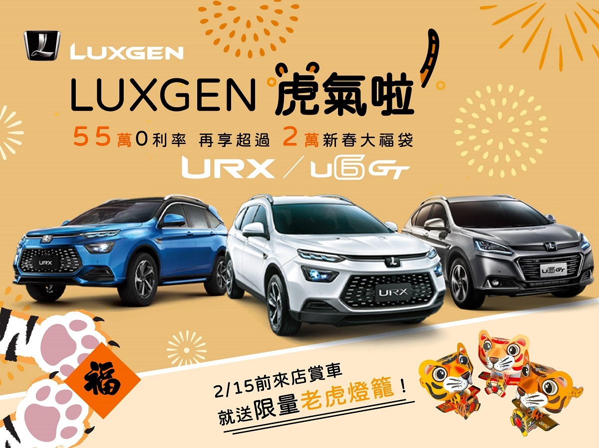 LUXGEN歡喜迎接2022福虎年到來,特別祭出「LUXGEN虎氣啦」新春優惠專案(1),讓你新年開新車,安全舒適的與家人朋友返鄉團圓、春遊踏青!凡於2/1(二)至2/25(五)止,入主LUXGEN URX樂活版、URX紳活版、U6 GT全車系,即享55萬分期零利率優惠(2),讓你輕輕鬆鬆開新車,並加碼再送價值二萬元以上新春大福袋(3):包含原廠導航(價值10,000元),指定型號隔熱紙(價值11,000元),同步免費升級PM2.5健康對策濾網(4)、終身免費返廠實施臭氧殺菌服務等好禮回饋!歡迎喜愛LUXGEN的準車主們敬請把握最佳入主愛車好時機。