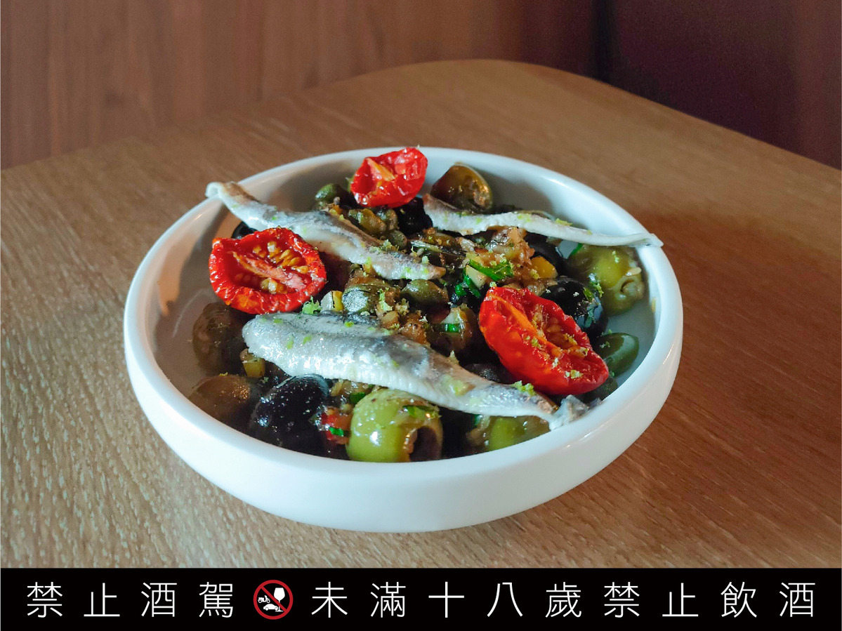 白鯷魚橄欖」(200元)以肉質鮮嫩的白鯷魚,搭配熱炒過的黑橄欖與綠橄欖,再加入檸檬皮與朝天椒,整體口感豐富有層次,為下酒良伴,搭配草本香氣的「柏克金經典皮爾森啤酒」,令人忍不住一口接一口!