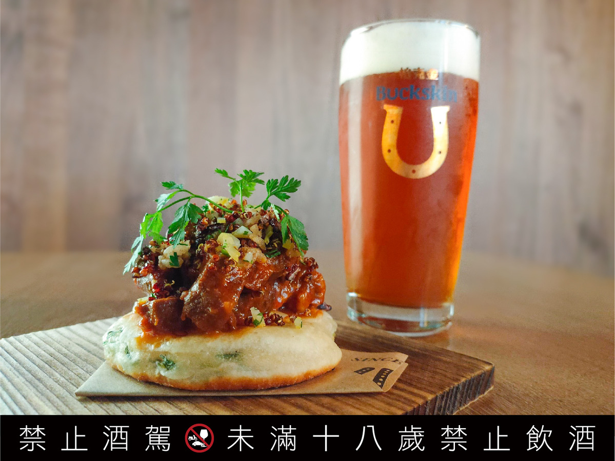 「燉牛蔥油餅」(150元)將自製宜蘭式蔥油餅煎到外皮金黃酥脆,在上面毫不客氣加上由柏克金啤酒與紹興酒一起燉煮而成的重量級燉牛肉!上桌就能聞到濃郁酒香,讓嗅覺、視覺、味覺,彼此連結激盪出多重饗宴!推薦搭配使用傳統慕尼黑麥芽釀造而成的「柏克金窖藏啤酒」,琥珀色的酒液帶著焦糖餅乾般的烘烤麥香,尾韻乾爽,適合重口味的料理,完美平衡口中的鹹淡滋味。