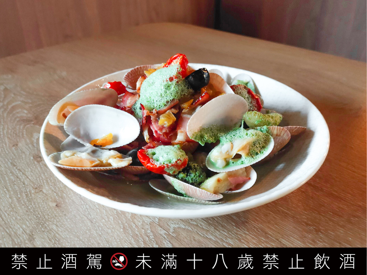 「煙燻金棗海蛤」(350元)以金車噶瑪蘭威士忌加入蒔蘿做成的綠色泡沫搭配新鮮海蛤、糖漬金棗與傳統古早味煙燻臘肉,整體風味中西合併,還有各種辛香料點綴,適合搭配同樣帶有辛香調性的「柏克金德式小麥啤酒」