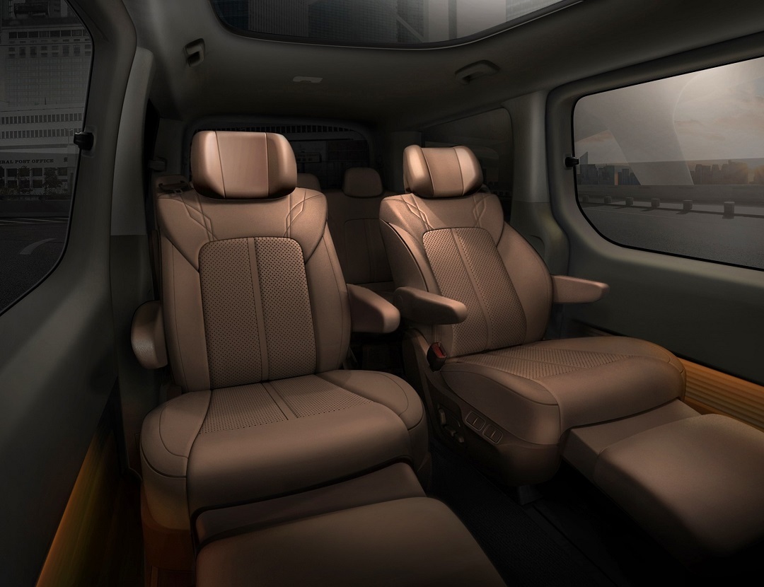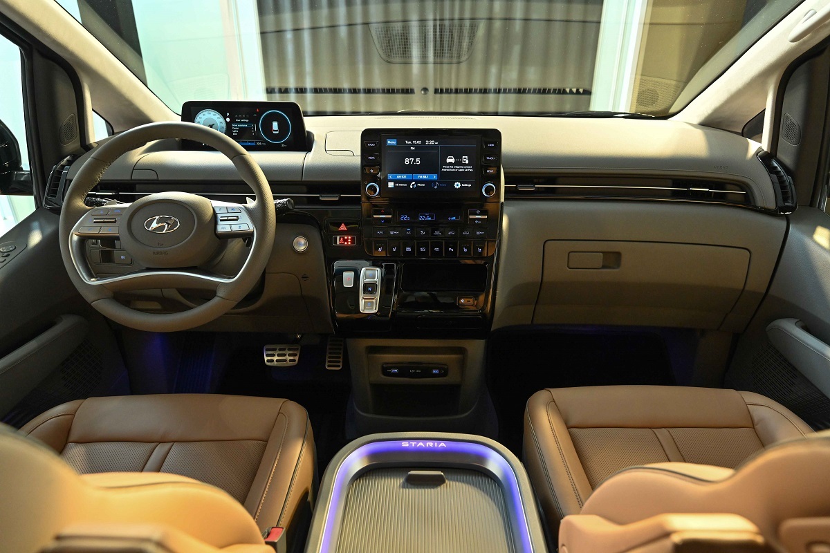 STARIA以豪華遊艇內裝思維打造,導入車型分別提供七、八、九人座三種設定,透過低腰線的大側窗及多變化座椅,帶出最開闊平整化的駕駛乘坐視野,人因優化的科技觸控介面,進階新科技包含10.25吋數位儀表、全新8AT手自排變速系統、SBW電子線傳排檔附換檔撥片與智慧型手機無線充電功能,讓駕馭與乘坐時擁有更舒適、更豪華、更未來的感受。成功人士的STARIA CEO 款附頂級NAPPA真皮座椅,具備座椅面通風、加熱及仰躺功能,並且前後大型雙天窗,行駛在都市或城郊都能盡情享受截然迴異的景緻。