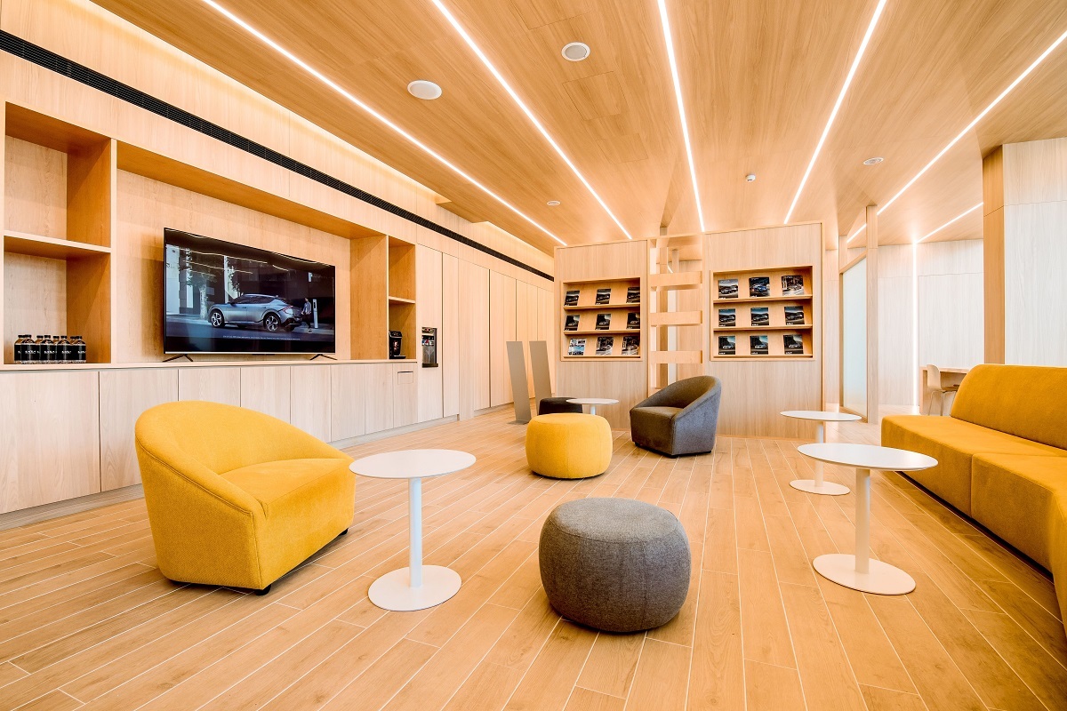 此次台灣森那美起亞攜手嘉樂寶汽車,總計耗資超過5,000萬元,於占地近700坪的基地面積,打造Kia全台首座符合CI 2.0規範的3S展示中心。Kia北台中展示中心以提供Simple簡單、Intuitive直覺和Integrated整合的客戶體驗理念打造,外觀以簡約的黑灰白色系建構,與以線條勾勒的全新品牌識別相互輝映。展示中心內部的顧客體驗區,則以大量的木質建材,加上溫和的燈光線條點綴,營造簡約且溫馨的整體氛圍,並透過開放的空間,或以通透的玻璃隔間,增加整體視覺開拓性,讓視野不受限,展示中心內並特選用跳色但不突兀的單色織布沙發座椅,讓簡單的空間更添活潑趣味。