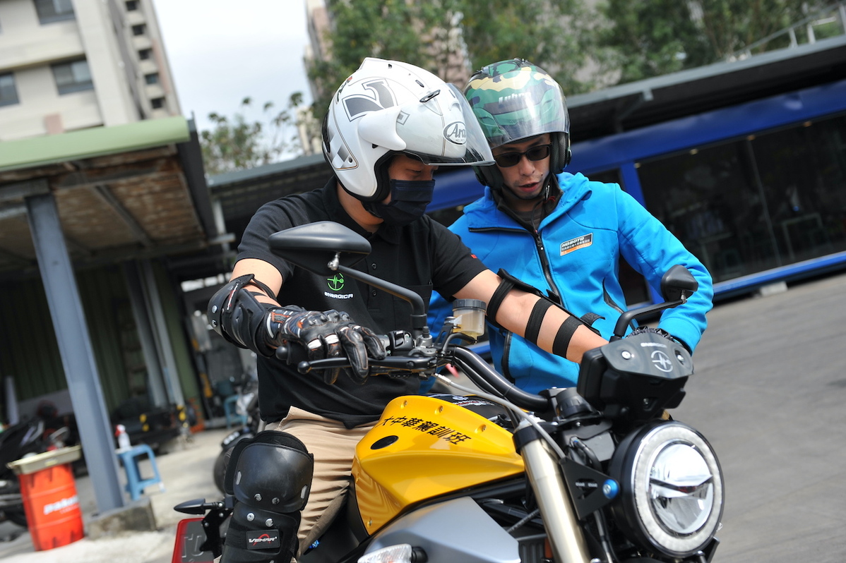 恒典摩托連鎖訓練機構旗下之新北市私立大中華駕訓班,教練帶領學員大重機考照路線。