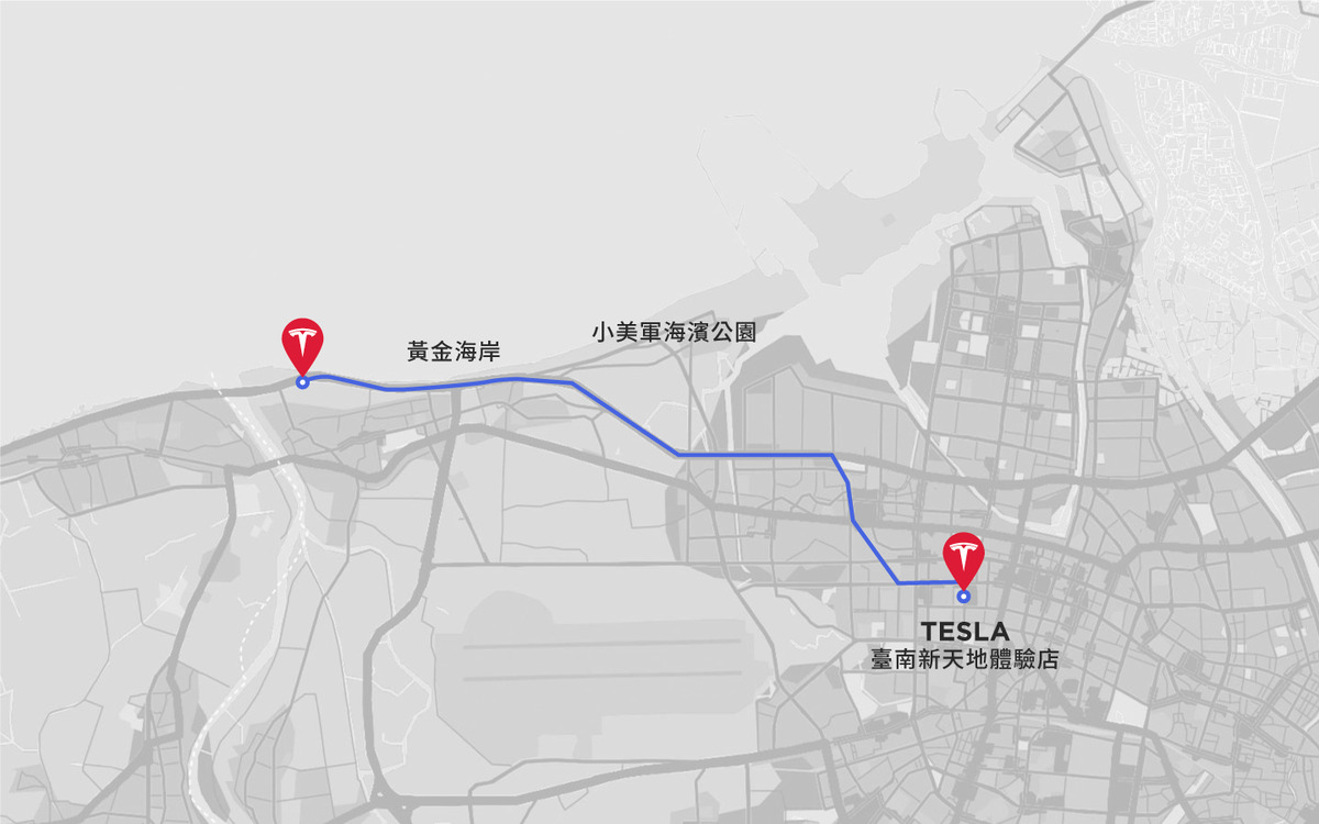 台南地區「春季限定試駕路線」由台南新天地體驗店出發,前往台南最美的「黃金海岸」,遠離城市喧囂,打造一趟最愜意舒適的試駕路線。更多店點試駕路線,請參考活動官網:https://www.tesla.com/zh_TW/campaign/spring-fes-2022