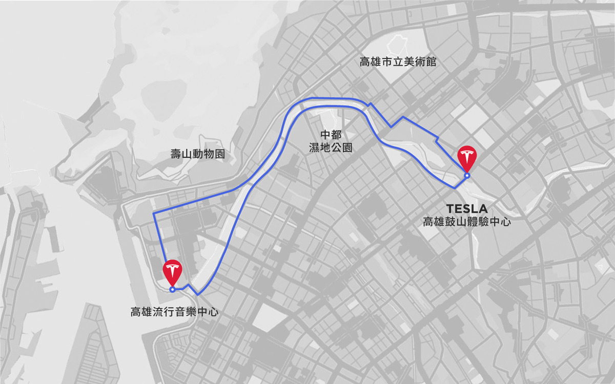 高雄地區「春季限定試駕路線」沿著愛河河畔,駛向高雄流行音樂中心與駁二藝術特區,在Model 3中體驗南台灣獨有的港都步調。更多店點試駕路線,請參考活動官網:https://www.tesla.com/zh_TW/campaign/spring-fes-2022
