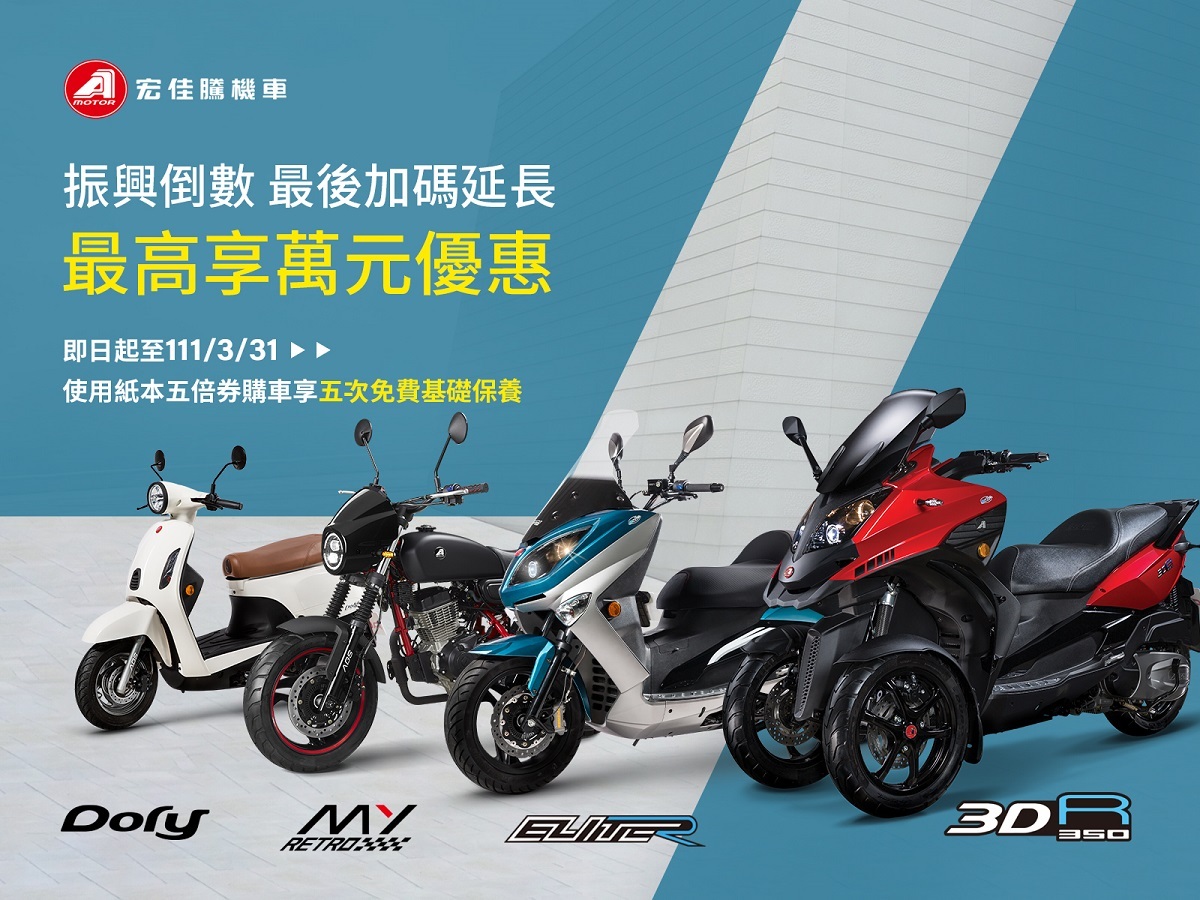 宏佳騰日前推出振興券購車加碼送5次免費基礎保養的「振興豪禮 萬里保養最挺你」,大受車友好評。感謝消費者支持,宏佳騰推出活動再延長至3月31日,即日起只要是憑紙本振興券購車,不限使用面額,皆可享全車系白牌車款或黃牌重機最高36期0利率,而除了超優惠分期利率外,凡購買指定車款再享限時專屬購車禮,想搶好康的民眾敬請把握最後機會。