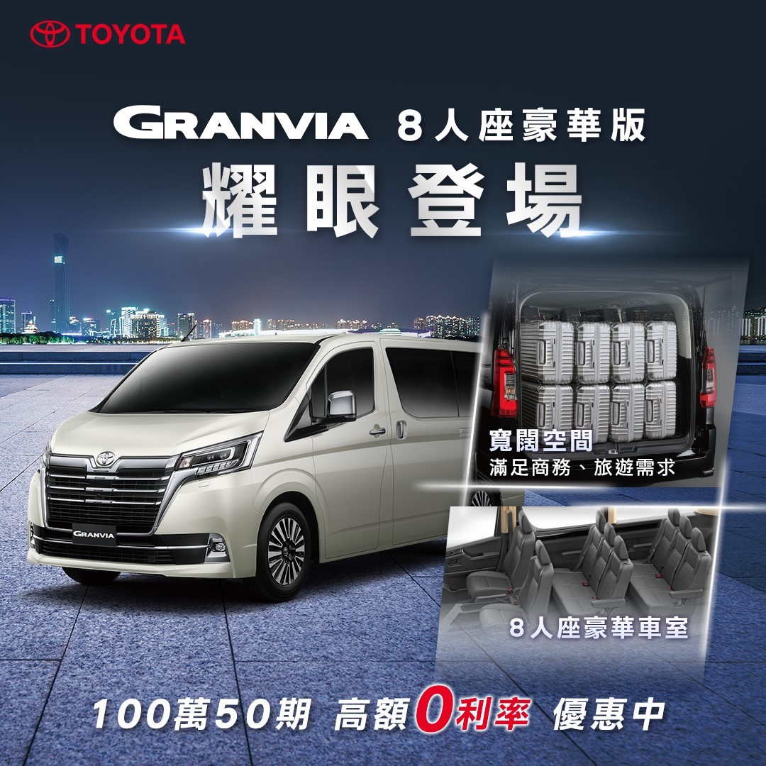 TOYOTA GRANVIA自2019年在台上市以來,大氣穩重的外觀,以及寬敞舒適的乘坐舒適性,深受《商務用車》、《精緻接送》等’消費者的喜愛。今年總代理和泰汽車特別推出8人座豪華車型,行李置物空間全面升級,同時滿足多人乘載與寬敞行李空間。目標鎖定《機場接送》、《包車旅遊》業者,以及《多代同堂家庭》的顧客,提供全新的購車選擇。