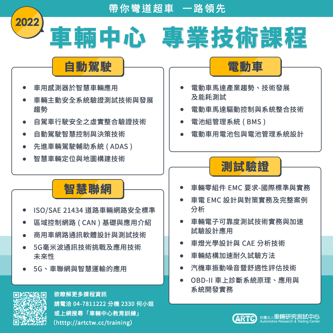 車輛中心科研成果豐碩,將近年研發成果及驗證能量透過系統性的學習課程,分享給產業先進,歡迎有興趣者共襄盛舉,為自我的專業職涯鍍金,更多課程資訊請上網搜尋「車輛中心教育訓練」(http://artctw.cc/training)或電洽04-7811-222分機2330企劃推廣處何小姐以了解更多課程訊息。
