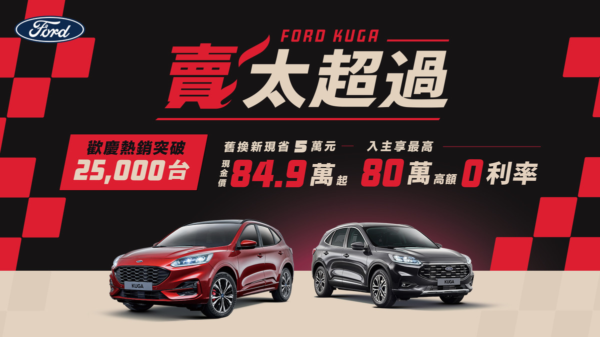 福特六和歡慶全新第三代New Ford Kuga「純正運動跑旅」在台上市至今超過一年半,累計銷售破25,000台,回饋消費者推出「New Ford Kuga賣太超過!」優惠,並獲熱烈好評,將此限時優惠延續至四月底,凡入主New Ford Kuga可享舊換新現金價84.9萬起,或最高80萬高額0利率優惠購車方案,讓消費者輕鬆坐擁純正運動跑旅,以及極致性能跑旅ST-Line X。