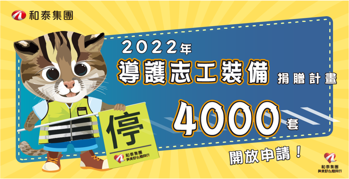 和泰集團致力守護導護志工與學童「行」的安全!連續11年已捐贈共11萬套導護志工裝備,2022年預計再捐贈1萬套,包含統一捐贈新北市、高雄市6000套導護志工裝備,次及即日起開放其他非統一捐贈之縣市學校,有需求的國中國小都可線上申請導護志工裝備,總計捐贈4000套,活動將於4月底截止,讓我們一起守護全台學童們上下學的交通安全!