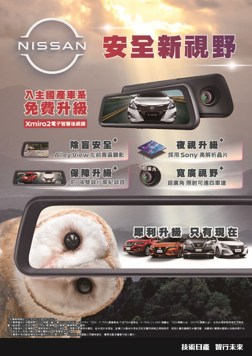 KICKS、SENTRA、TIIDA、X-TRAIL等國產車系(惟不包含TIIDA經典版、TIIDA黑爵士版、X-TRAIL 2.5 4WD 旗艦版、SENTRA 黑爵士版),並完成領牌程序者即可享免費升級「Xmiro2 電子智慧後視鏡」配備服務。