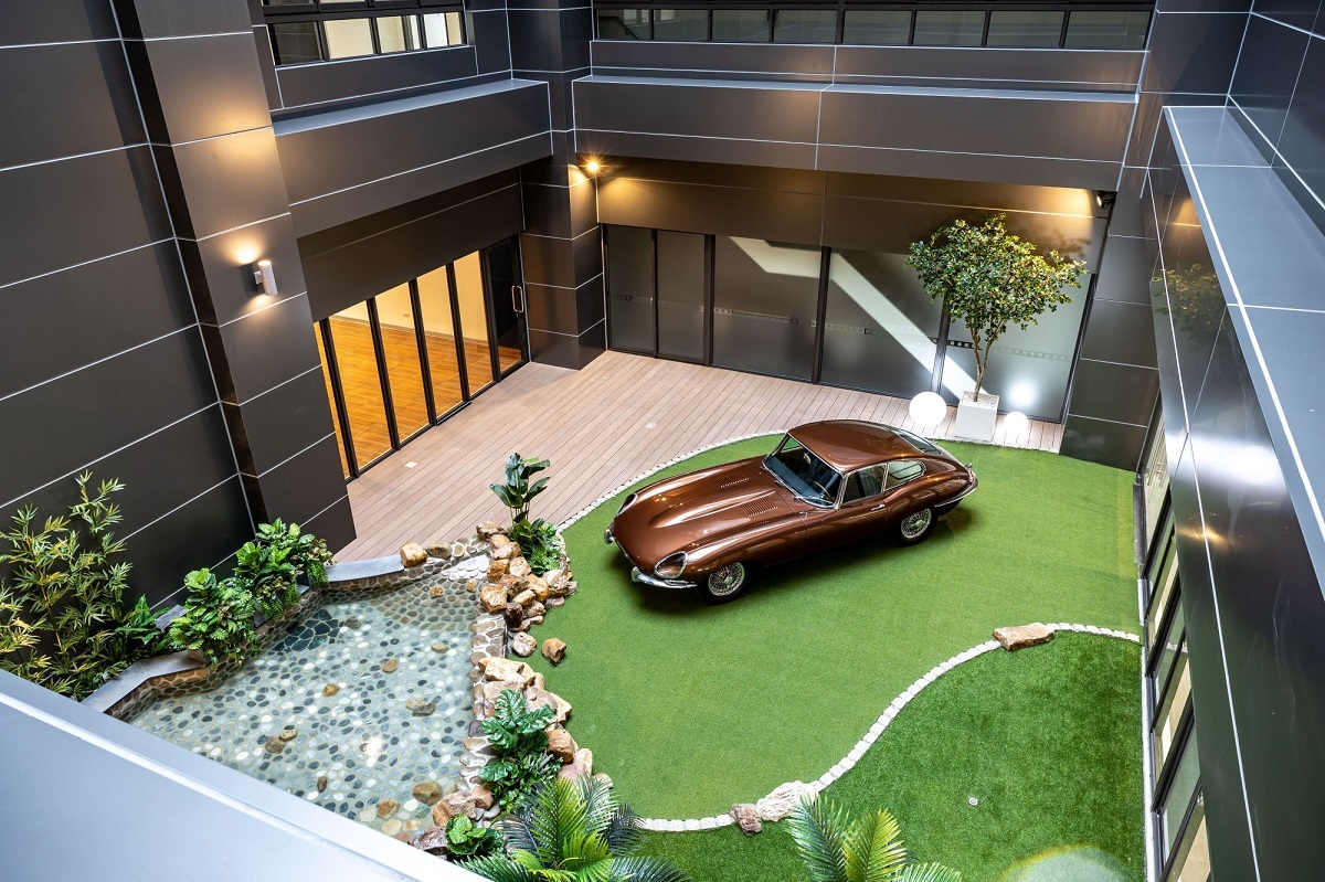 為提供來賓奢華舒適的頂尖服務環境,全新旗艦據點導入數位化展間的概念,展示區建設高速 Wi-Fi、動態顯示車色外觀設備、AI 智慧人工柵欄即時接待等,提供更為專業且快速的服務。建物擁有全台唯一天井設計,下方設置自然景觀造景與塔形噴水池,提供另一個愜意的親子共同休息空間,提供客戶更為尊榮舒適的購車體驗。