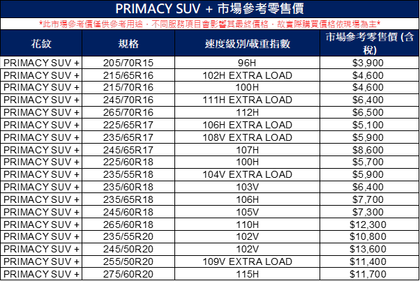 近年國內休旅車款因靈活的載運空間受到消費者愛戴,既能滿足工作通勤需求,也可營造與家人舒適的乘座體驗,但休旅車的大尺碼也造成一些休旅車主們的困擾,其中包含車身較重造成的長剎車距離及高車身重心的晃動不適感。為此米其林提供PRIMACY SUV+,這款輪胎不僅擁有PRIMACY系列在靜音的優勢,其長效濕地制動表現也同步提升,新增22%排水空間的U型溝槽及高矽配方的胎面橡膠,讓此款輪胎溼地剎車距離與他牌相比縮短了 13.3%。此外米其林也創造優秀的磨耗表現,胎面「溝槽自鎖技術」能讓胎塊間相互支撐,增加最大接地面積並強化乾地制動;「胎塊倒角技術」可提供胎塊變形時空間及維持接地面積,為消費者帶來更佳的使用體驗。全新 PRIMACY SUV+是台灣休旅車主在同級產品選擇中,最能感受里程及舒適表現差異的標竿產品。目前供應主要尺寸為 15~20 吋,寬度從 205~275 mm、扁平比從 50~70。