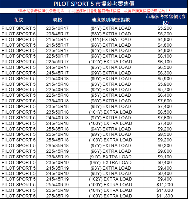 PILOT SPORT 5在優秀基礎下,針對胎面下足功夫。為了讓輪胎承受乾濕地面的操駕,並維持一致的性能表現,全新調校的膠料配方,與內外側晴雨設計,內側快速疏水溝槽可增加排水效率,降低水漂風險;外側剛性強化花塊增強接地面積,搭配源自賽道的動態回應科技,可精準傳達方向盤指令,進一步強化過彎循跡穩定性。PILOT SPORT5經第三方數據顯示與他牌輪胎相比,新胎乾濕地剎車距離分別短2.97M及3.09M,經過長時間使用後在溼地表現更出色,磨耗胎剎車距離平均減少6.53M。