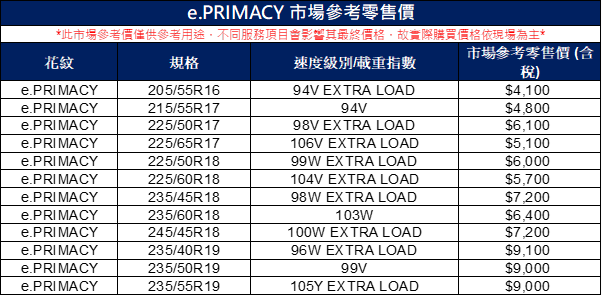 因應汽車市場趨勢,米其林決定於今年導入專為新能源車開發的e.PRIMACY,提前為迅速膨脹的新能源車輪胎市場做準備。米其林將新能源車主遇到的痛點,都納入產品研發的重點項目。目前e.PRIMACY供應主要尺寸為 16~19 吋,寬度從 205~245 mm、扁平比從 40~65為主。e.PRIMACY三大產品特色如下: