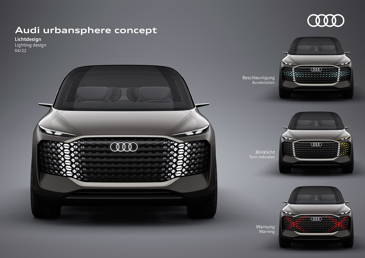 Audi urbansphere concept 採用長軸距、短前懸的四環電動車經典設計語彙,而團隊在車頭外觀設計部分亦作創新突破,採八角型的造型,雖Singleframe 已非擔任過往進氣閘口的功能,於urbansphere 上藉由創新數位化科技,Singleframe 演化為「Audi Light Canvas 燈光畫布」可對外進行溝通,透過動態燈光效果向其他道路使用者發出如Warning警示、Acceleration加速中及Turn indicator轉向指示等溝通信號;而車頭上方左右兩側照明設計呼應四環Logo圓圈交疊的部分,如眼睛瞳孔的「Audi Eyes」,可自動偵測適應交通狀況、環境、甚至乘客的情緒,於日間行車燈啟動時,像虹膜般調整燈光的聚焦程度,展演更進化的燈光科技。
