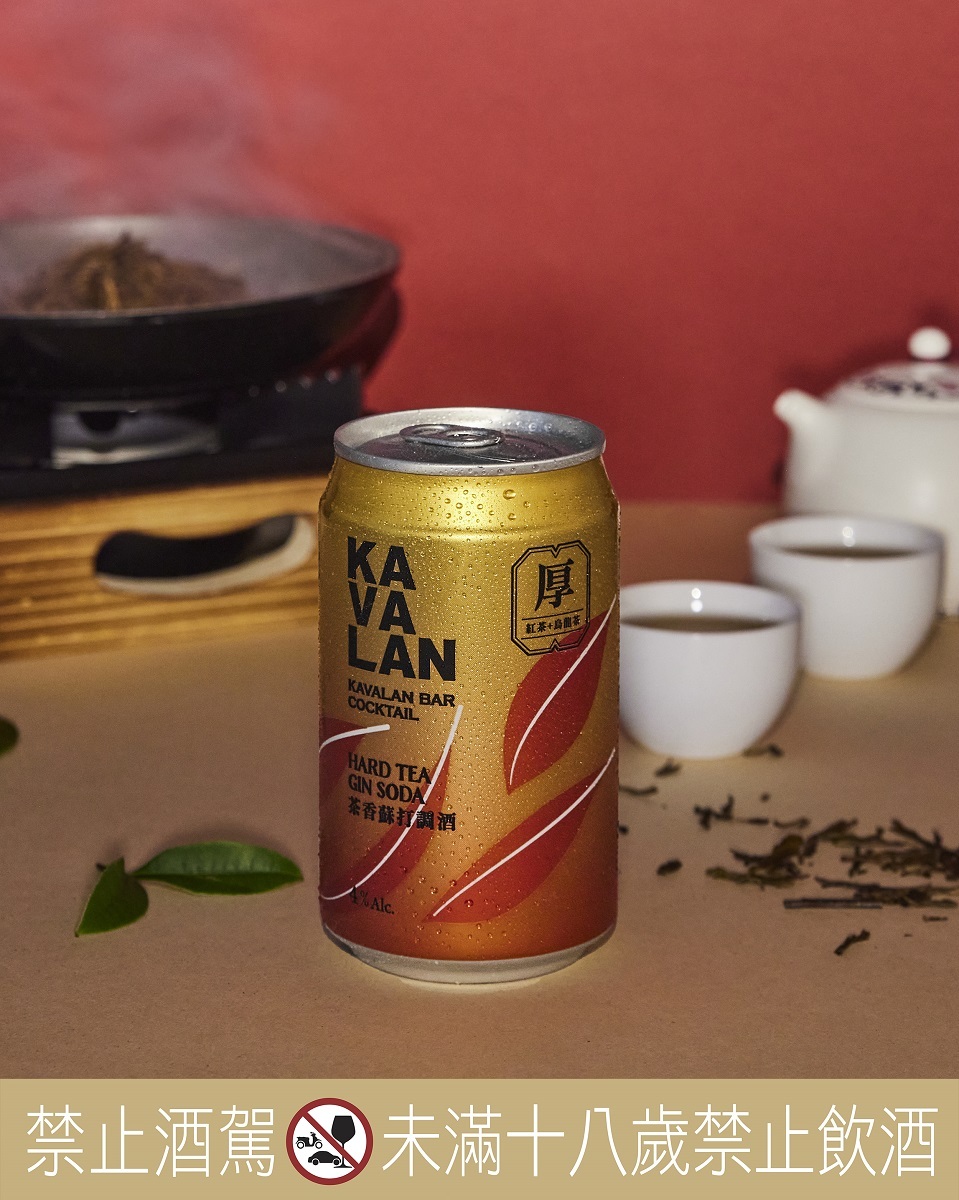 「噶瑪蘭茶香蘇打調酒Hard Tea Gin Soda」揉合烏龍茶迷人的焙火香氣及紅茶的豐厚喉韻,再融合噶瑪蘭琴酒的多層次水果與草本調性,茶香酒韻口口回甘;包裝呼應茶湯色澤,飄動徜徉的茶葉傳達雙茶與噶瑪蘭琴酒融合的清新繚繞,罐身的金屬光澤則象徵上品茶湯的明亮透徹,「厚」字標籤以茶包意象展現厚實茶香。