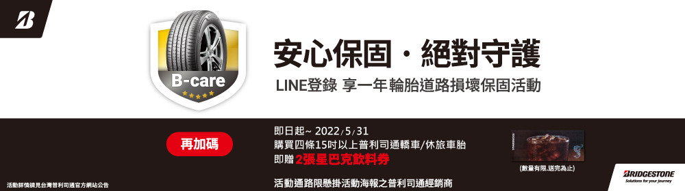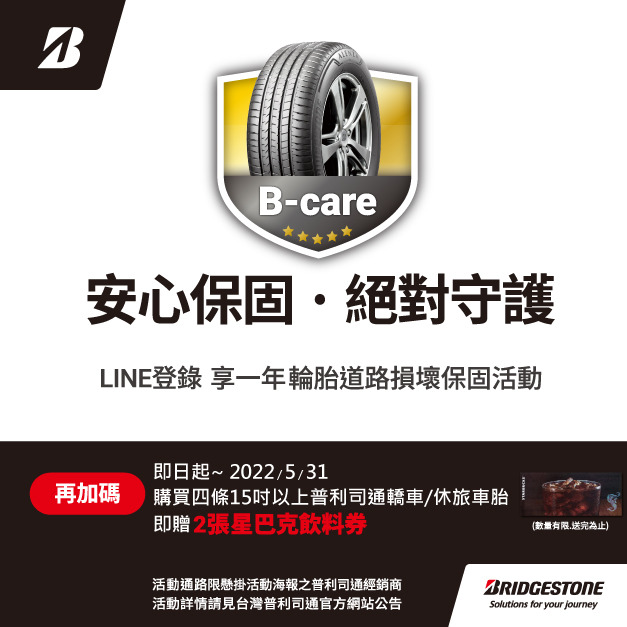 輪胎為汽車接觸地面的唯一部件,然而道路條件隨時考驗著輪胎安全,為守護大眾的旅途安全,讓顧客享有無負擔的售後服務,台灣普利司通即日起全新推出「B-care安心保固 絕對守護」活動,領先業界祭出全面性購胎路損保障,擴大保固範圍涵蓋指定輪胎所有吋別、不限行駛里程數且殘餘溝深3.5mm以上,凡一年內購胎並完成活動步驟,經判定輪胎受道路損壞無法修補,即享本保固服務。5/31前購胎還有機會加碼獲得星巴克飲料券,以回饋給廣大消費者。活動詳情請參考活動公告https://www.bridgestone.com.tw/zh/special-offers/202205_warranty