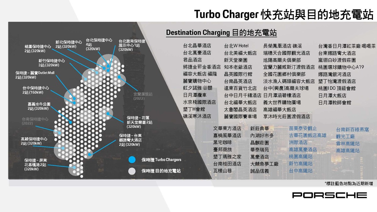 台灣保時捷宣布在台灣東部新增高速充電站 (Turbo Charging)據點,於台東娜路彎大酒店設置保時捷高速充電站,進一步優化東部的充電服務,提供保時捷車主更完善的充電地圖,及無後顧之憂的純電移動旅程。保時捷純電跑車Taycan車主保時捷高速充電站、保時捷目的地充電站、以及遍布全台超過3,100多個公共充電站,享受更加便捷、完善之充電體驗,保時捷電動車主可拋下里程焦慮,安心駕駛,暢遊全台。