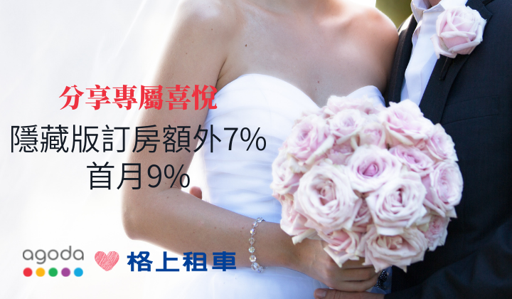 除了線上訂車的限定優惠外,格上與Agoda合作,額外再祭出專屬9%訂房折扣優惠,搭配Agoda感謝祭的九折優惠活動,網羅共有超過百家的全台飯店,要在國旅市場低迷時,讓消費者預先規劃出遊、出差,並享有最優惠的價格及服務。