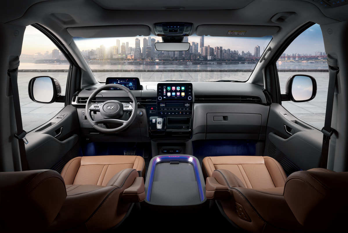 全新STARIA豪華商旅大器空間,MPV緊湊的機械結構引擎室,將車艙空間最大化保留給乘客,前驅底盤設計搭配前麥花臣獨立懸吊附防傾桿、後多連桿獨立懸吊附防傾桿,不僅全體乘員舒適性大幅提升,後座及後廂空間更顯寬敞。突破舊式商旅框架,STARIA高等級的駕駛座12向電動座椅、同級首見SBW電子線傳排檔、先進8AT手自排變速系統、10.25吋數位儀錶以及全車系標配的Qi無線充電座、Drive Mode多重駕馭模式,創造如乘用駕駛的便利。專屬禮遇後座層峰人士的配備更顯尊榮,雙側智慧感應電動滑門,科技感應自動啟閉,豪華二排搭載雙獨立RELAXION零重力電動座椅、NAPPA極致皮革包覆,具備通風、加熱、四向腿靠及一鍵仰躺的極致紓壓功能,並配備二、三排獨立恆溫空調、大型雙天窗,移動之間極盡享受;務實兼顧商用多人乘坐以及載運需求,智慧電動尾門及第三排座椅長滑軌設計,將空間高度化運用。