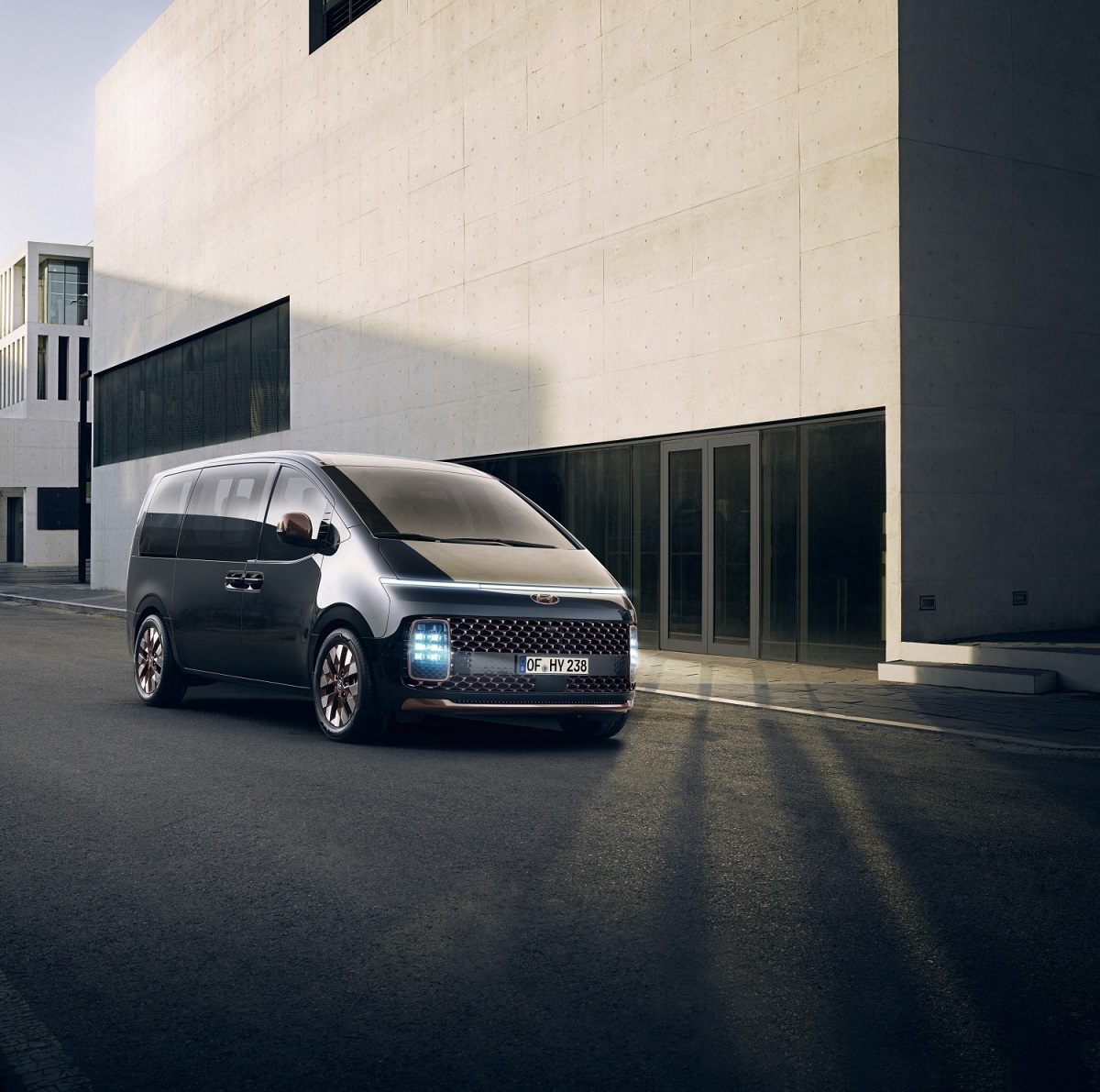 HYUNDAI STARIA以至臻創新設計賦予豪華MPV商旅新風貌,如同命名由STAR(星星)與RIA(波浪)合組字,外型概念源自星際旗艦造型,刻意傾洩延伸的開闊前擋加上低腰線大面積側窗,打破傳統商旅方正印象,車艙設計則是以駕駛與乘客的角度出發,營造360度寰宇透視感,橫貫中央LED日行燈設計猶如星月光影冉冉升起之姿,引領不同以往的成功之路。為彰顯CEO車型旗艦細節處豪華質感,專屬玫瑰金色蜂巢水箱護罩巧妙與矩陣式LED頭燈組合而為一,車側後照鏡與幾合切削造型鋁圈同樣佐上玫瑰金色,車尾顯眼明亮的光柱型像素式LED尾燈。車艙集結飛航頭等艙概念,舒適坐躺、全景視野、極佳材質觸感與機能收納,HYUNDAI新世代設計語彙傳達的創新、尊貴、大膽,正是展現未來之星獨具慧眼的豪華MPV商旅選擇。