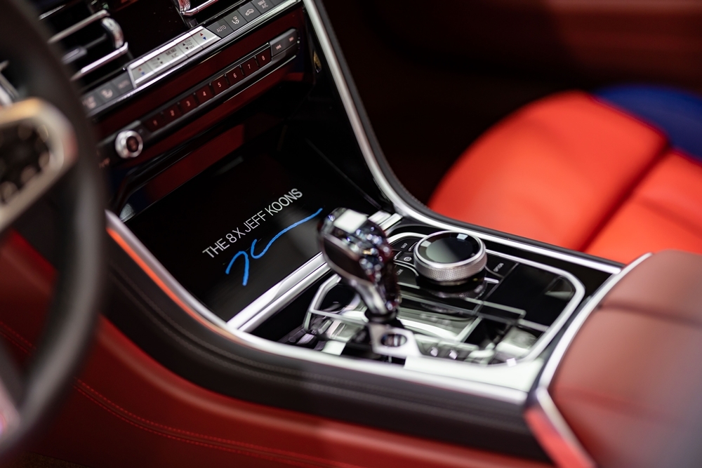 「THE 8 X JEFF KOONS」的力量和速度,車尾爆炸性的高彩度線條也是向自己於 2010 年所創造的BMW Art Car致敬。座艙空間耳目一新的俏皮風格一覽無疑,座椅由強烈的紅色和明亮的藍色形成鮮明對比,使人聯想到漫畫世界中超級英雄的顏色以及BMW M品牌的代表色,其他內飾設計由BMW一貫的高端材質和精美皮革所組成,而杯架飾板上的簽名Jeff Koons特別選擇了BMW標誌性的巴伐利亞藍,將經典與潮流完美融合於BMW M850i Gran Coupé中,同時每輛車均附有Jeff Koons簽名證書與限量車的專屬車輛編號。