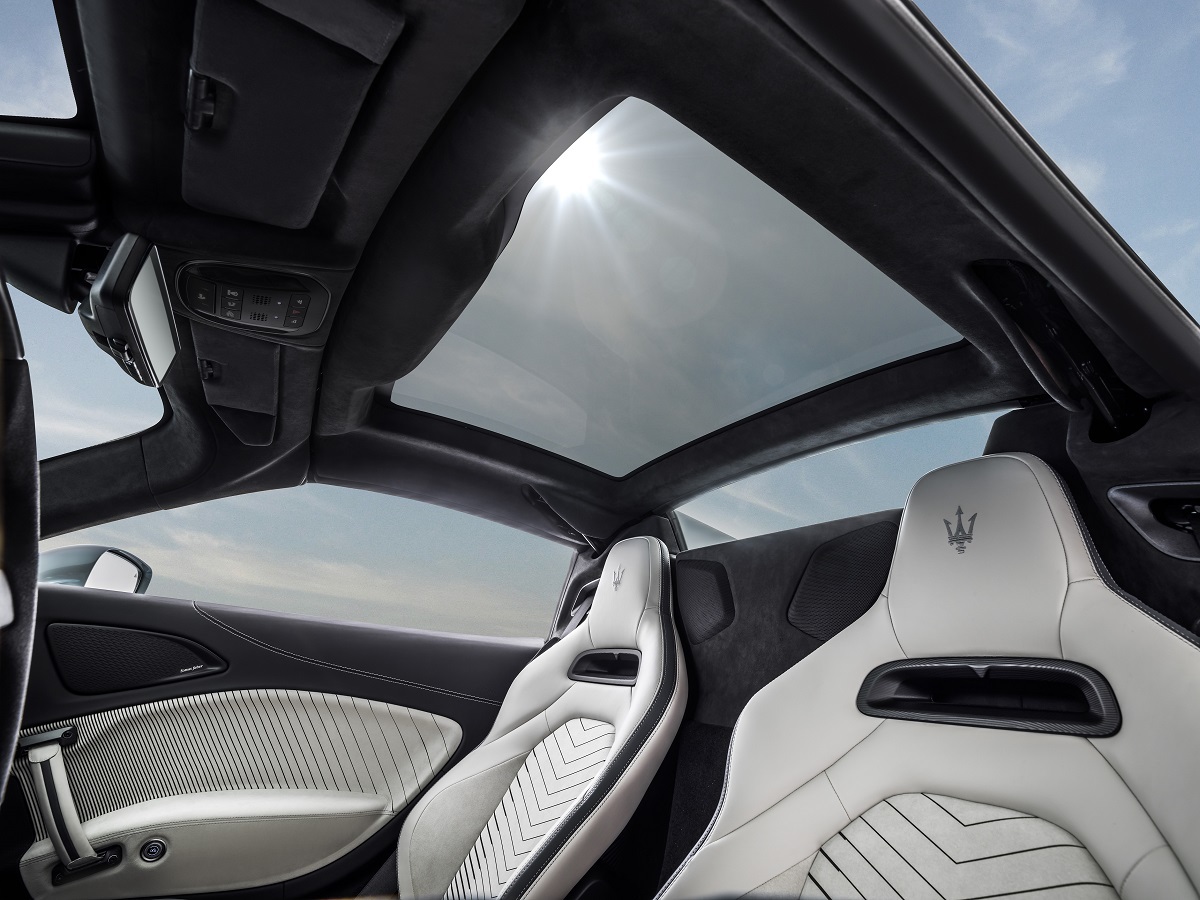 MC20 Cielo 最令人驚豔之處,莫過於電動硬頂敞篷設計,它採用獨創的先進智能變色玻璃,透過電控液晶玻璃(PDLC)調節,不論身處任何溫度環境,只需輕觸中控螢幕上按鍵,頂棚即可在透明與隱密之間隨心切換,並達到良好的隔熱效果。同時,這款獨領風潮的頂棚當車速在50 km/h内,僅需12秒即可輕鬆完成啟閉動作。藉由不同的模式切換,MC20 Cielo不管在頂棚開啟,亦或是頂棚閉合、切換至透明天景時,皆能感受到「Sky feeling」的設計理念,享受領略天際、陽光灑落的駕馭體驗。